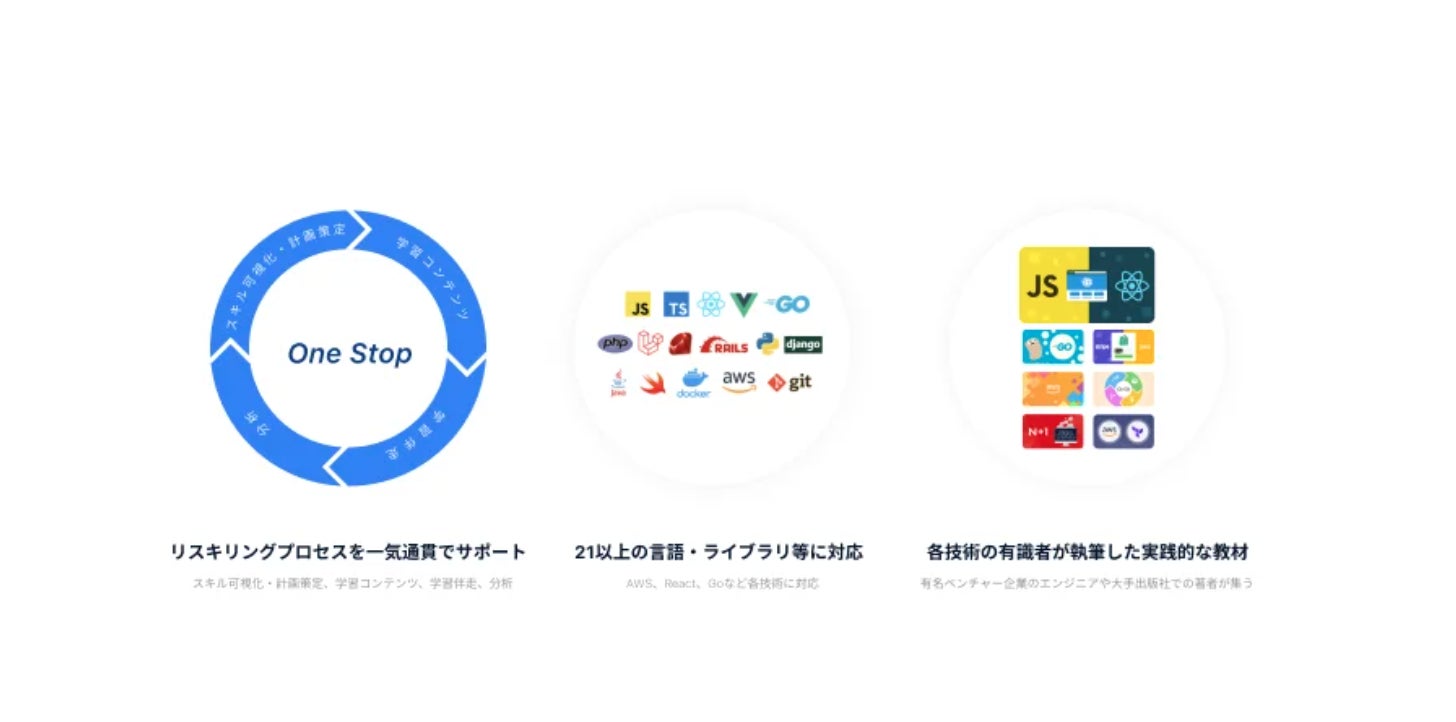 「Techpit for Enterprise」では、学習プログラムの提供だけでなく、人材育成計画の策定から学習の完了支援まで、「リスキリング」に必要なプロセスを一気通貫で支援します。スキルアセスメントを受講することで、学習者の現在の理解度をチェックし、各個人の理解度に応じた最適なリスキリングプラン、学習コンテンツを提供します。