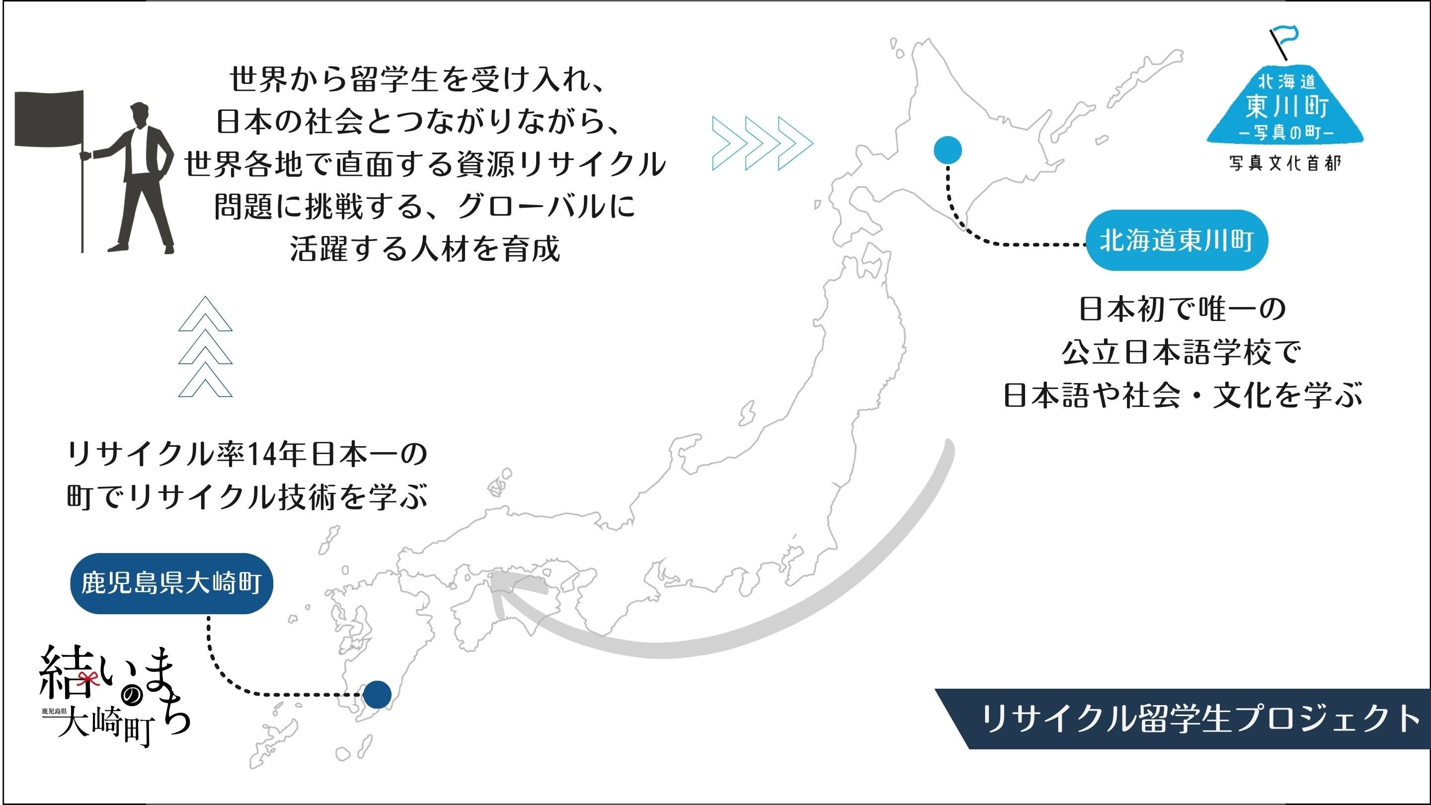同プロジェクトは、世界から留学生を受け入れ、日本初で唯一の公立日本語学校を営む北海道東川町にて日本語教育を行い、その後、 資源リサイクル率14年日本一を誇る鹿児島県大崎町において、資源リサイクルシステムの研修を行い、持続可能な社会の形成およびグローバルに活躍する人材を育成する取り組みです。