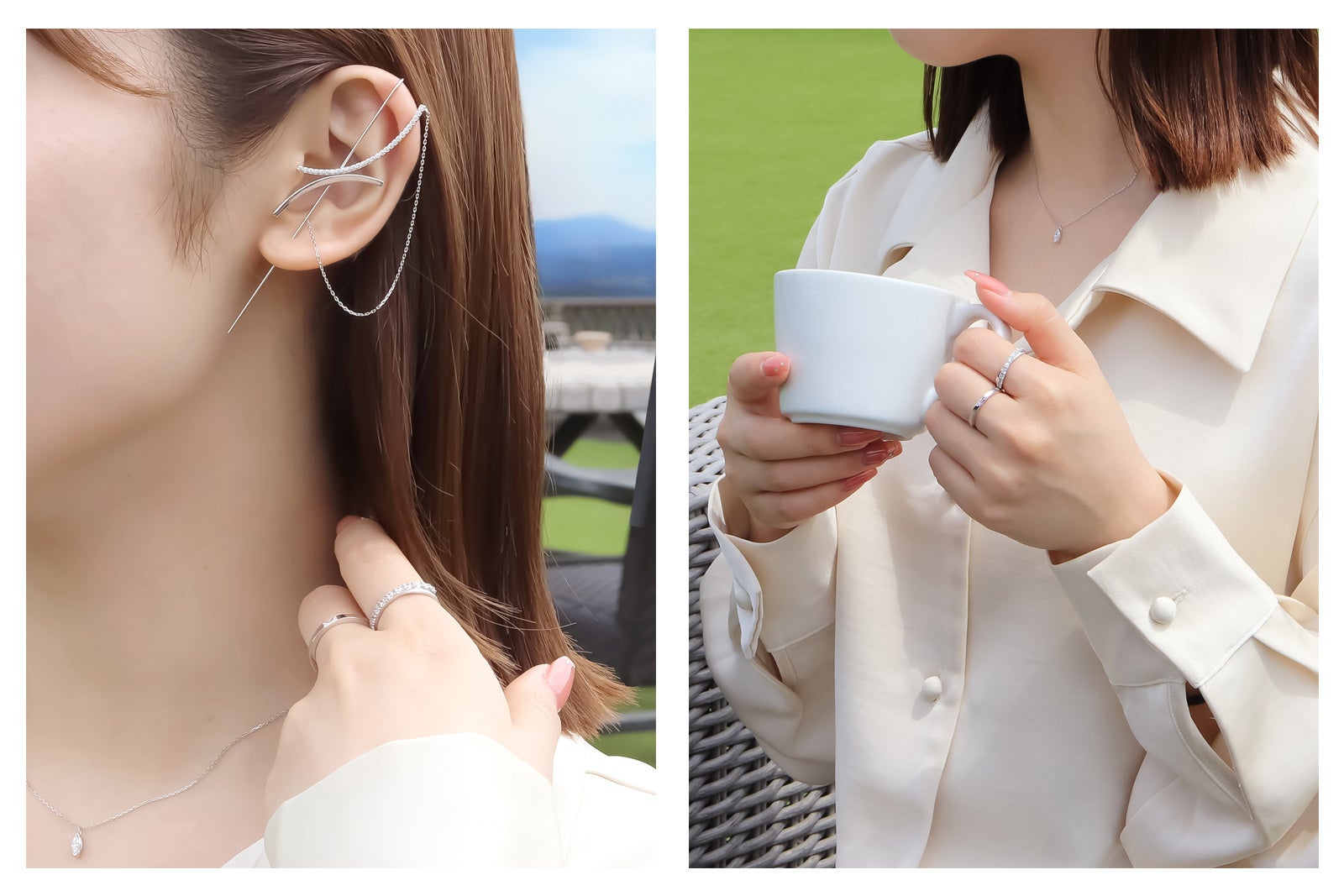 マグカップを手にした何気ない仕草の中でも、繊細なリングモチーフが上品な存在感を演出し、