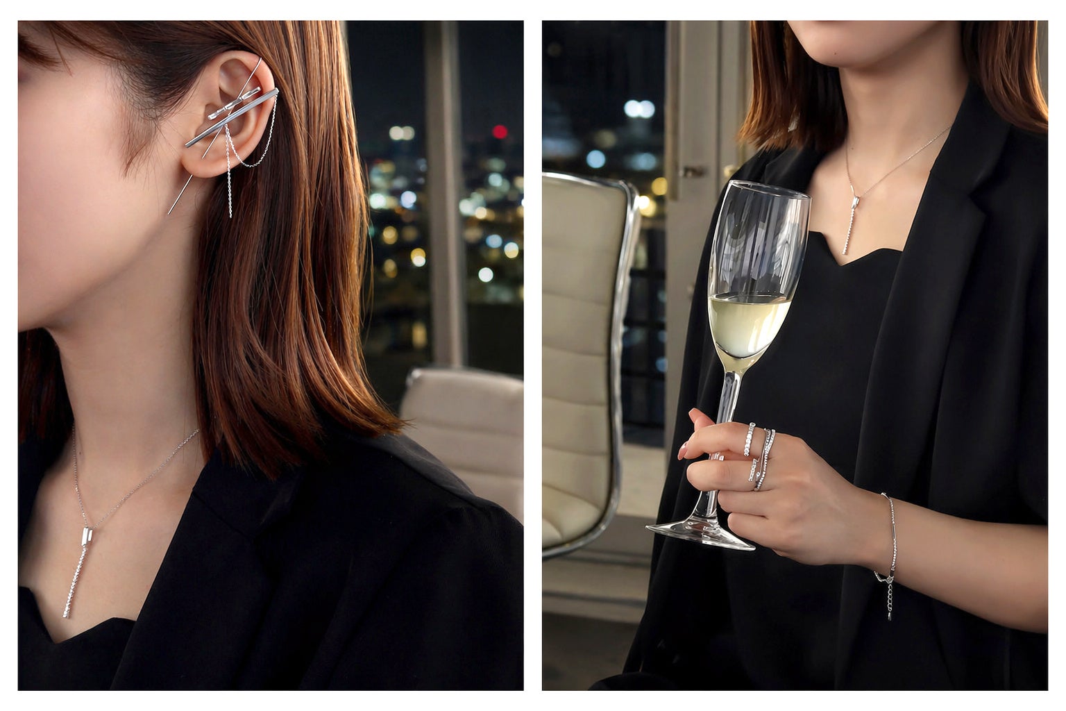 洗練されたシルエットに、チェーンデザインのイヤーフックピアスがシャープな輝きを添え、横顔に印象的なラインを生み出します。