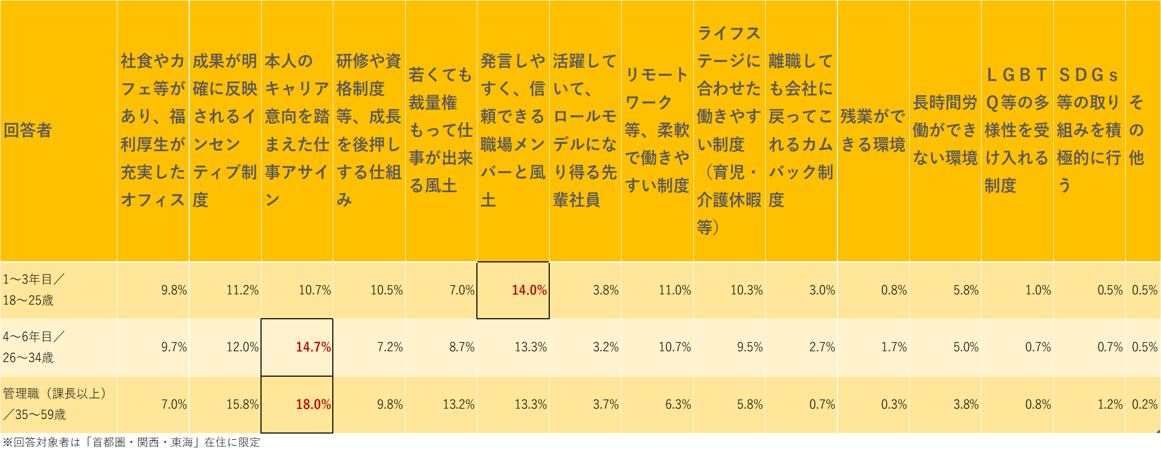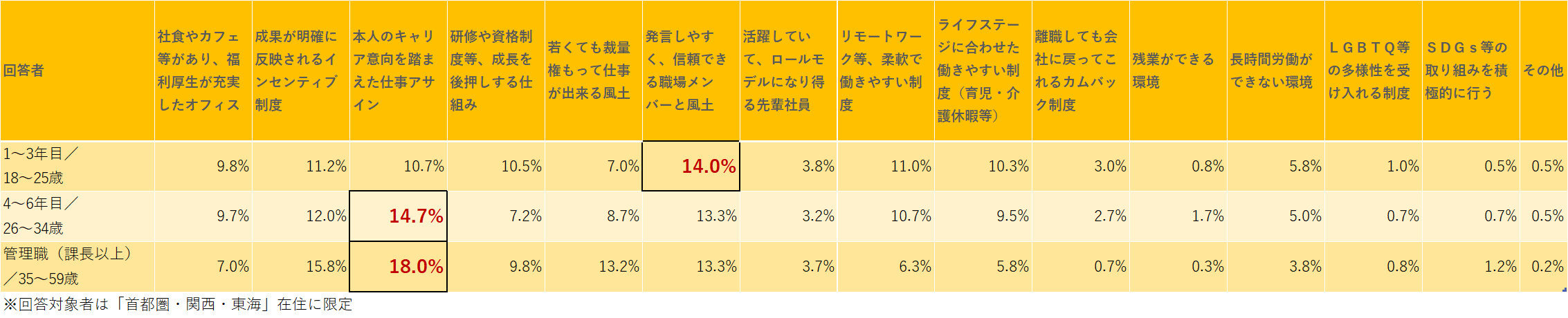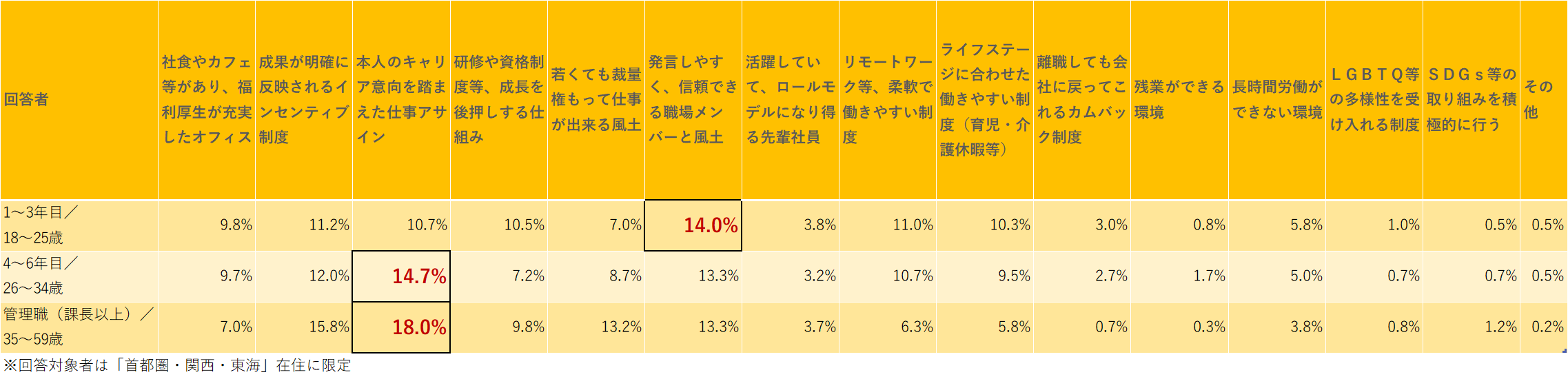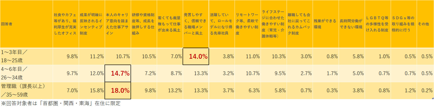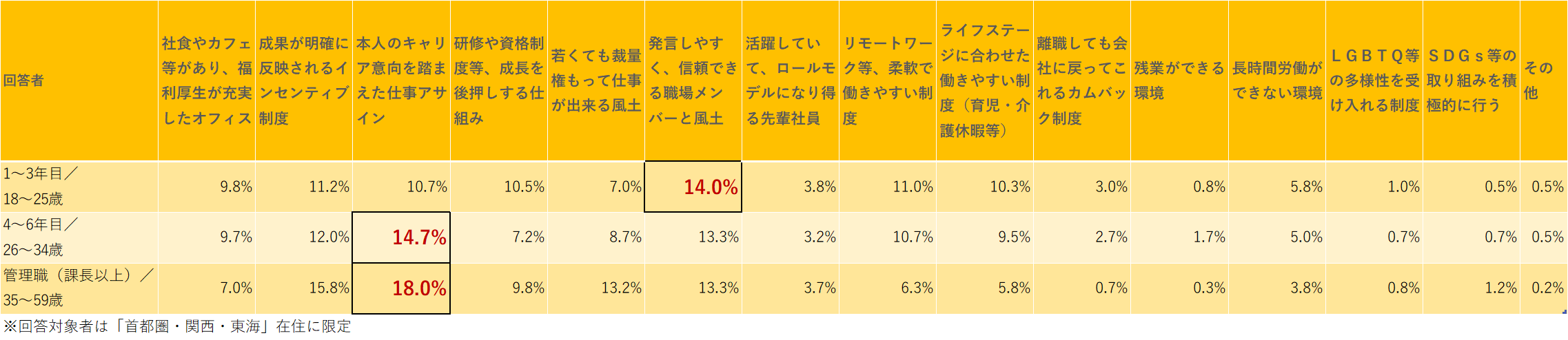 社会人1~3年目を想定した18~25歳は「発言しやすく、信頼できる職場メンバーと風土」。管理職は「本人のキャリア意向を踏まえた仕事アサイン」が第1位でした。