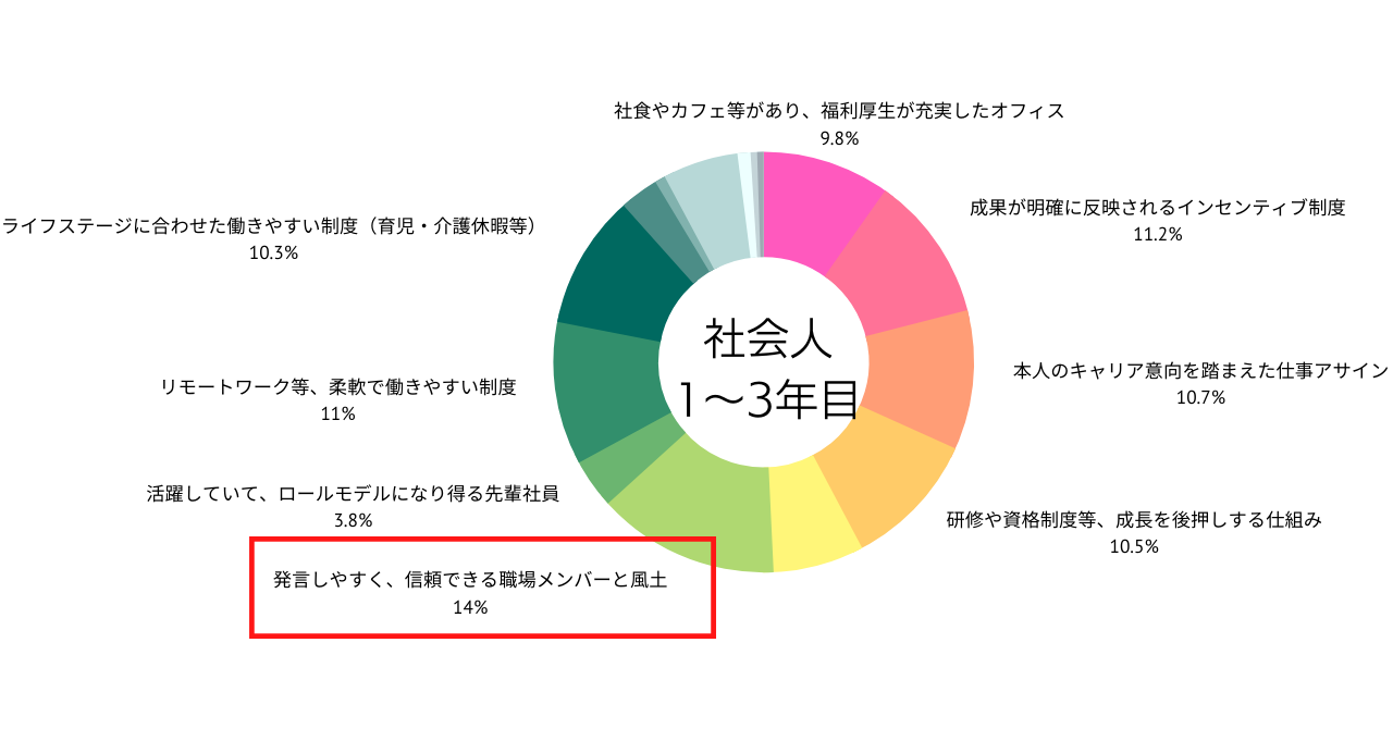 ・社会人1~3年目(18~25歳)の1位:発言しやすく、信頼できる職場メンバーと風土