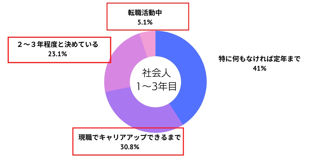 現在働いている会社にどれくらいの期間所属するつもりかアンケートに答えてもらったところ、社会人1~3年目の4割は定年までという気持ちで入社しているものの、6割は現職場にずっといることは想定していないことがわかりました。いよいよ人材流動化時代の傾向がみてとれる結果となっています。