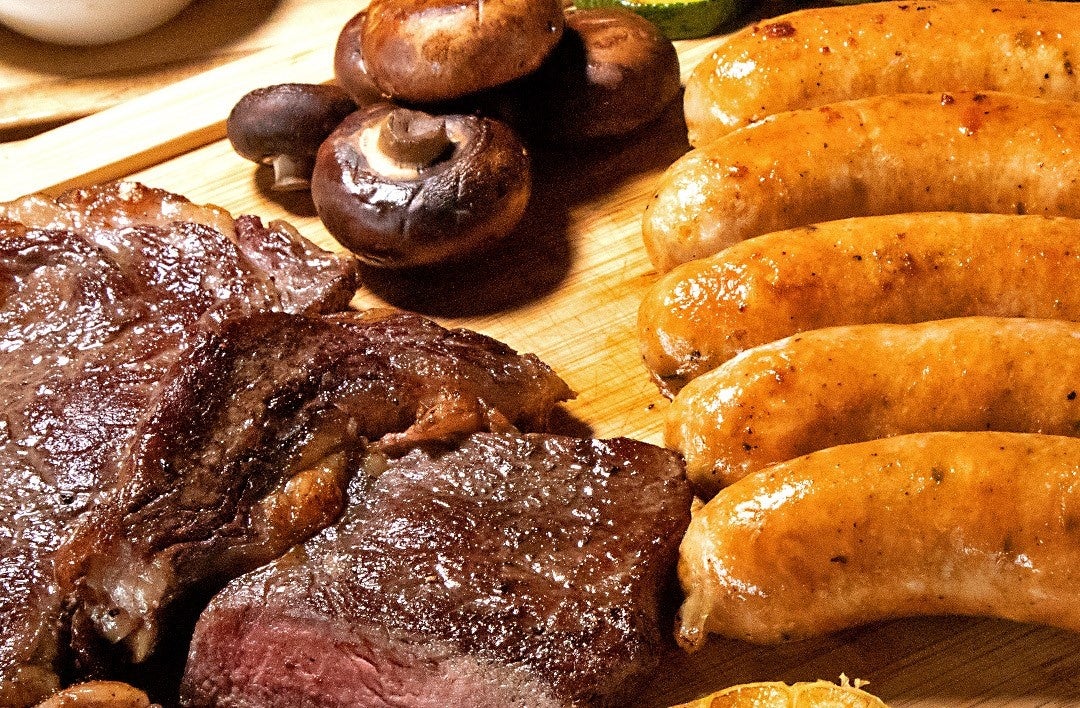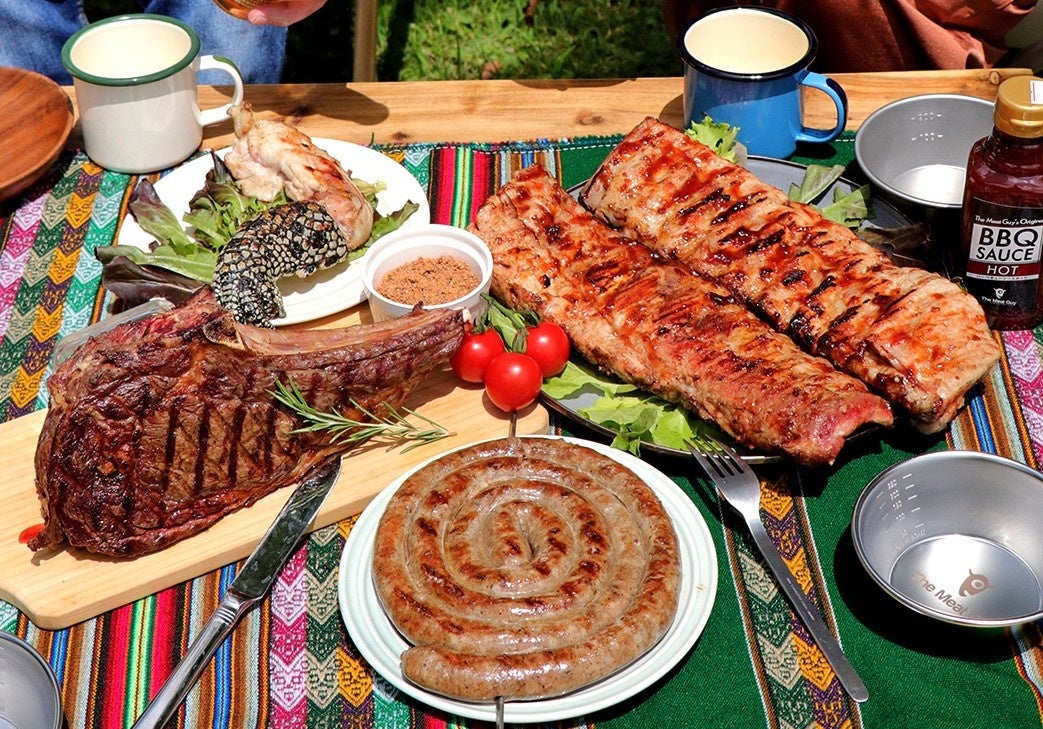 牧草牛のサーロインステーキやポークバックリブ、生ソーセージが入ったBBQセット。4人~7人分の量です。