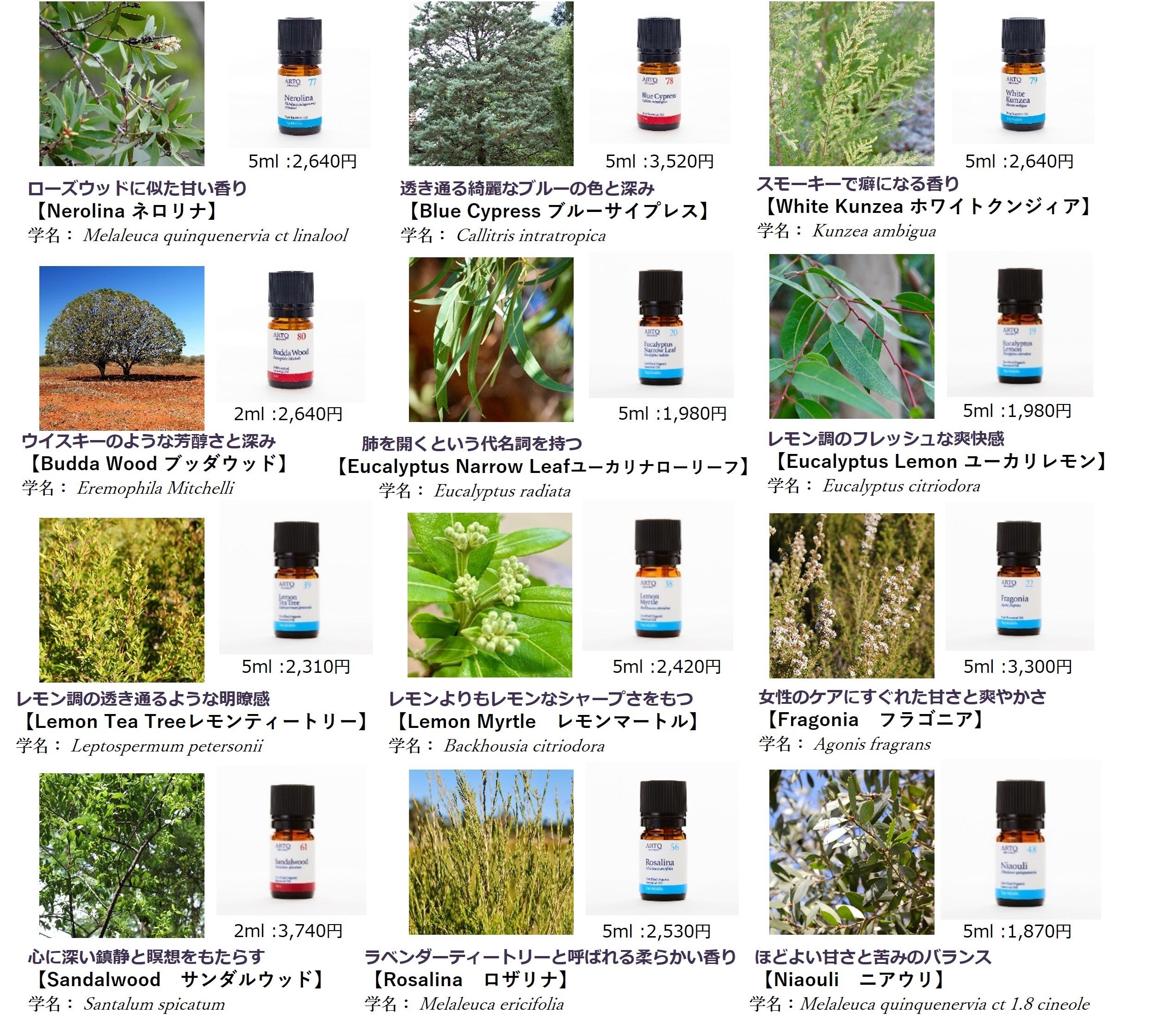 オーガニックティートリー、ネロリナ、ブルーサイプレス、ホワイトクンジィア、ユーカリナローリーフ、ユーカリレモン、レモンティートリー、レモンマートル、フラゴニア、ロザリナ、ニアウリ (各5ml)