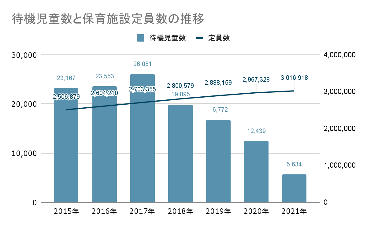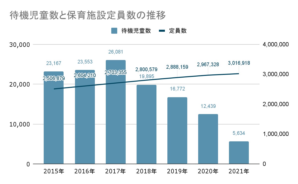 昨今、保育を取り巻く状況は大きく変化しています。厚生労働省のデータによると、2021年4月の全国待機児童数は5,634人で、前年の半数以下にまで減少し、調査開始以降最も低い数値となりました。