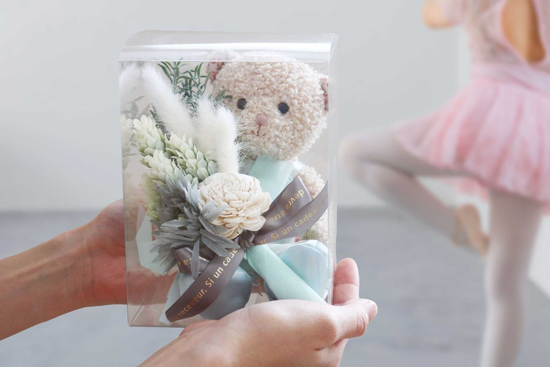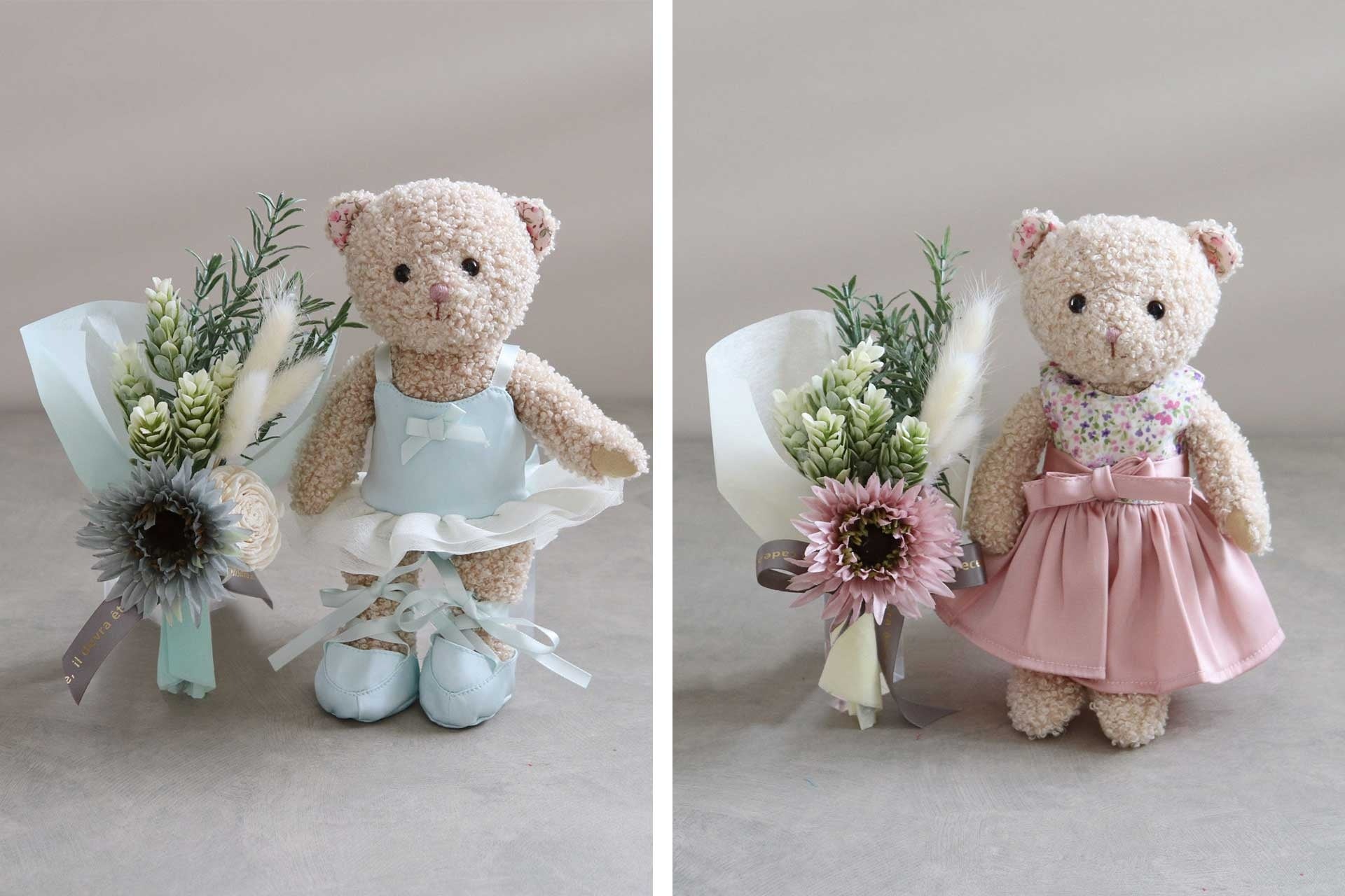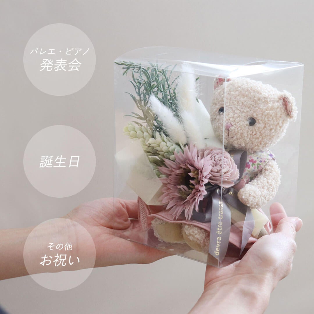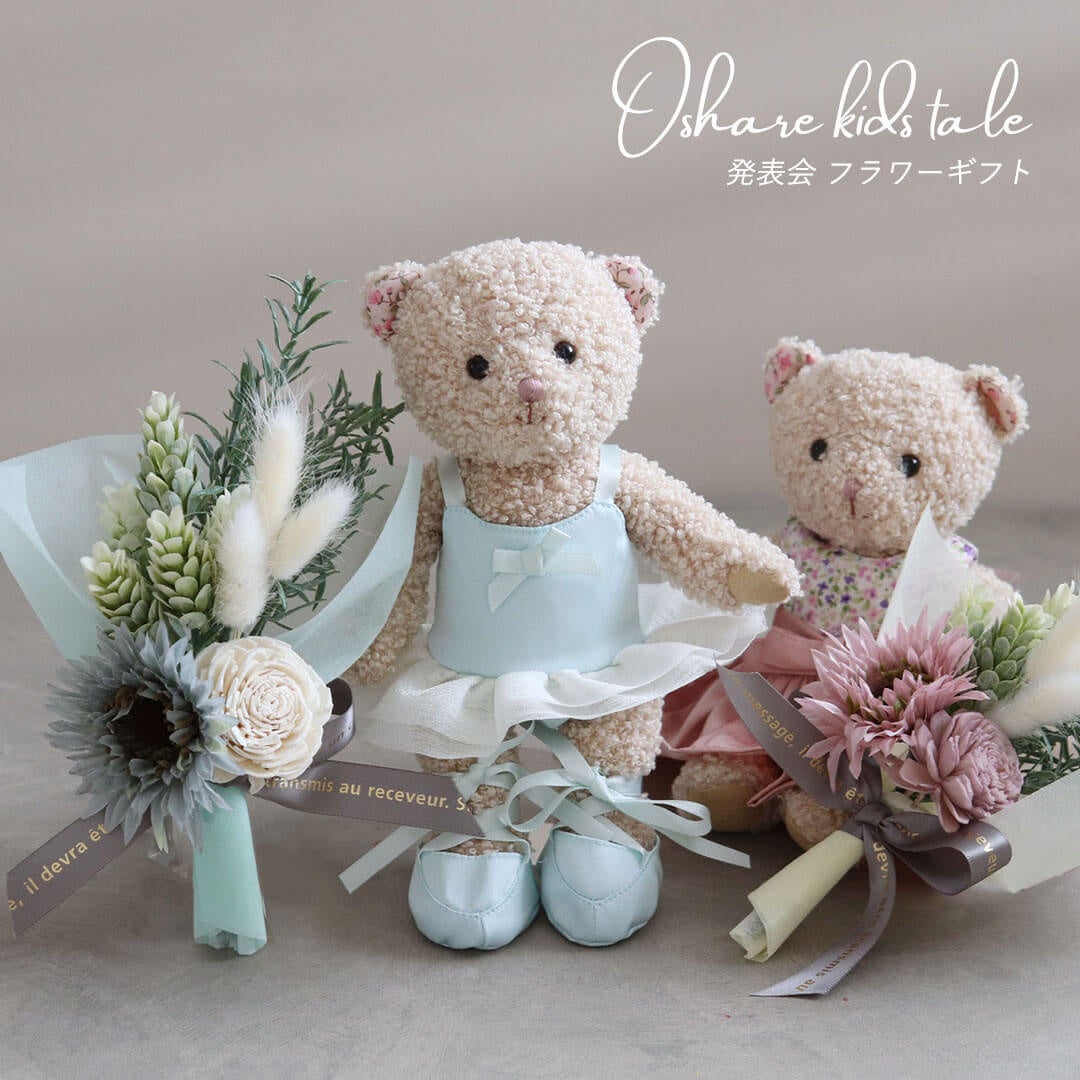 レオタードやドレス姿のテディベアが、頑張ったお子様やお友達へ花束をお届けする、かわいいをギュッと詰め込んだギフト。