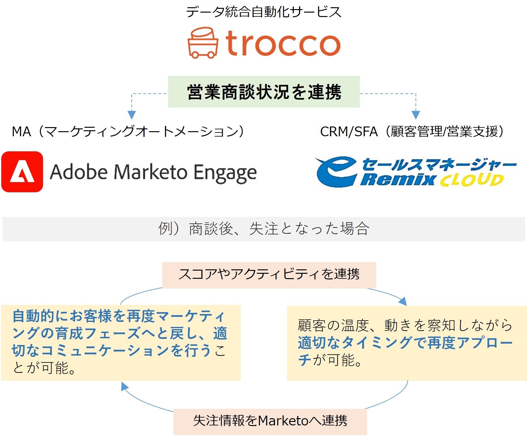 今回、「Marketo」「eSM」「trocco®」を合わせて提供することで、工数・コストをかけずにマーケティング・営業の成果を最大化できると考え、primeNumber、アドビ、ソフトブレーンの3社合同でソリューションを提供するに致りました。また、既存の「Marketo」ユーザーは「eSM」を、既存の「eSM」ユーザーは「Marketo」をそれぞれ導入頂くことで、より効果的なマーケティング・営業活動を行うことができます。既存の「trocco®」ユーザーは「Marketo」「eSM」と自前のデータ分析基盤を連携し、より幅広いデータ活用を行うことも可能です。