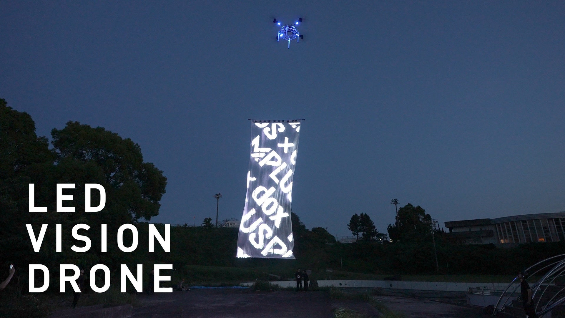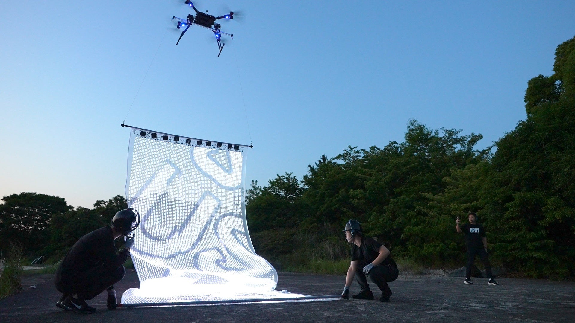 2018年に発表した「FlyingVision(https://www.mplpl.com/project/211/)」は、 ドローンの機体の外周にLEDを装着し、映像を出力していましたが、機体以上の大きさのLEDを装着することはできませんでした。第二弾となる今回の「LED VISION DRONE」は、機体の下部に積載可能な重量の範囲でLEDが装着された布製のディスプレイを吊り下げ、よりダイナミックな映像表現を可能にしました。