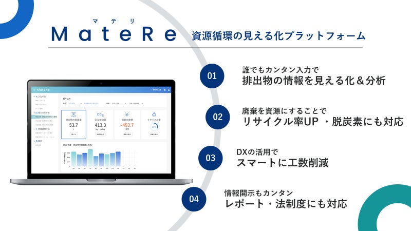 株式会社digglue(本社:東京都新宿区、代表:原 英之)は、2023年3月23日に廃棄ゼロ社会を目指す資源循環DXプラットフォーム*¹「MateRe(マテリ)」の第1弾として、排出状況の見える化と再資源化を支援する製造業向けSaaS「MateRe-Visualization」をリリースしました。