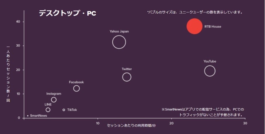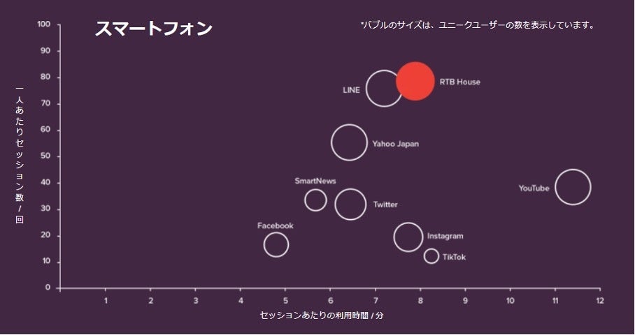 横軸(1セッションの滞在時間/分)、縦軸(1セッションの訪問者/数)とし、RTB Houseの広告でリーチ可能な日本でのユニークユーザー数はPCで約2700万人でした。オンライン動画サイトで人気のYouTube単体よりも格段に高いリーチ率を獲得しているという結果となりました。