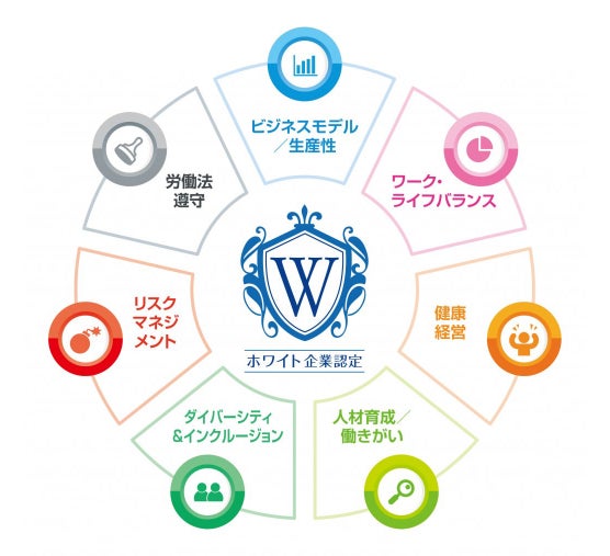 参加資格となる『ホワイト企業認定』は、企業がホワイト化に向けて取り組むべき70設問を7項目(ビジネスモデル/生産性、ダイバーシティ・インクルージョン、ワーク・ライフバランス、健康経営、人材育成/働きがい、リスクマネジメント、労働法遵守)にわけ、取り組みの有無を確認して認定を付与しています。一つの取り組みにフォーカスするのではなく、7項目をバランスよく取り組む企業を総合的に評価している認定は日本の組織において『ホワイト企業認定』のみです。現在累計247社*が認定を取得しています。