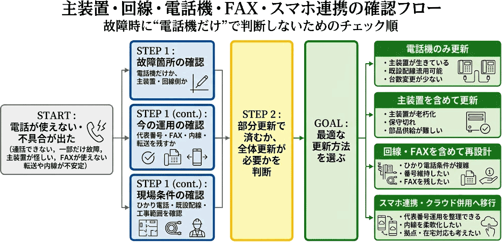 相談記録には、「主装置が古く、電話機だけ替えれば済むか分からない」「中古で安く抑えたいが、今の構成で使えるか不安」「ひかり電話やFAXを残したい」「スマホ中心にしたいが固定電話を完全には外せない」といった内容が継続的に見られました。