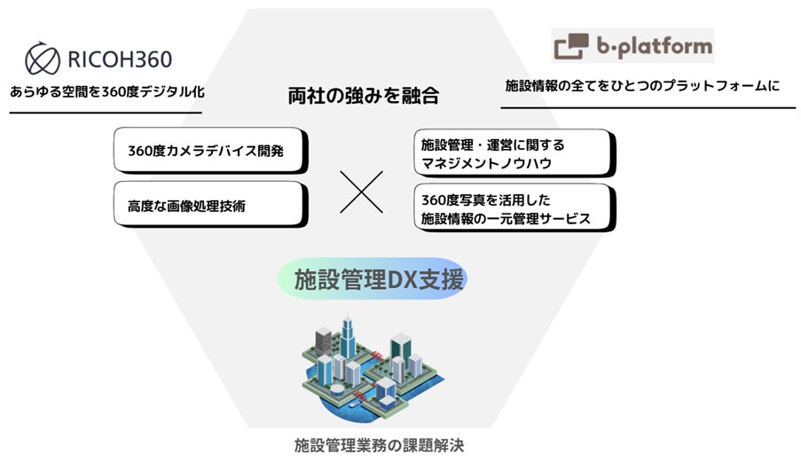 株式会社山下PMC(本社:東京都中央区、代表取締役社長:丸山 優子、以下「山下PMC」)と株式会社リコー(本社:東京都大田区、社長執行役員:大山晃、以下「リコー」)は、山下PMCの施設に関する情報を一元管理し知財に変える施設の情報管理システム「b-platform」事業と、リコーの「RICOH360」プラットフォーム事業との間で協業を開始したことをお知らせします。両社は今回の協業により、360度画像による建物・施設情報管理の分野で効率化と生産性向上を実現し、より優れた顧客サービスの提供を目指します。