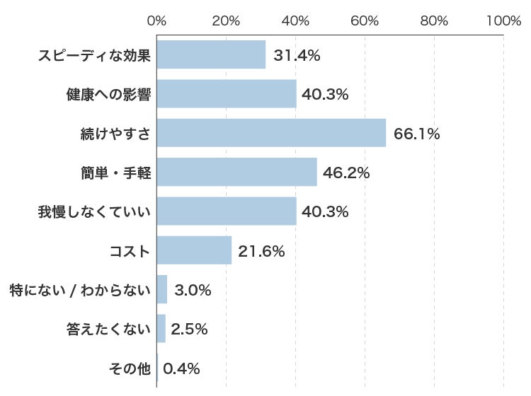 3人に二人が「続けやすさ」を重視。簡単・手軽も過半数近くに