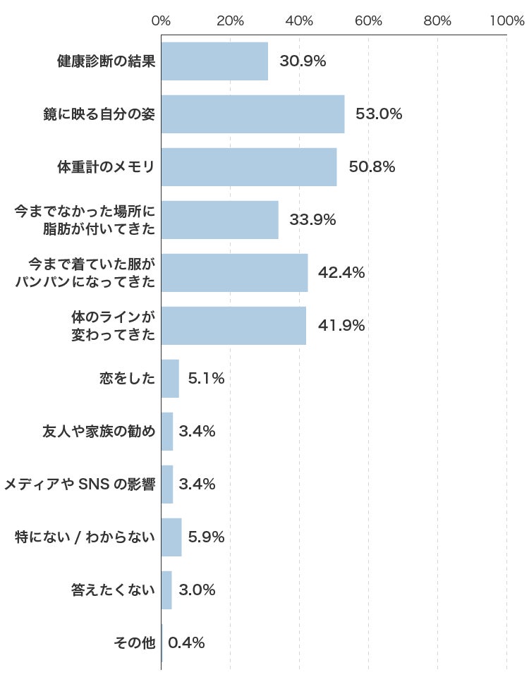 ■ダイエットを始めるキッカケは「鏡に映る自分の姿」「体重計のメモリ」がそれぞれ半数を超える
