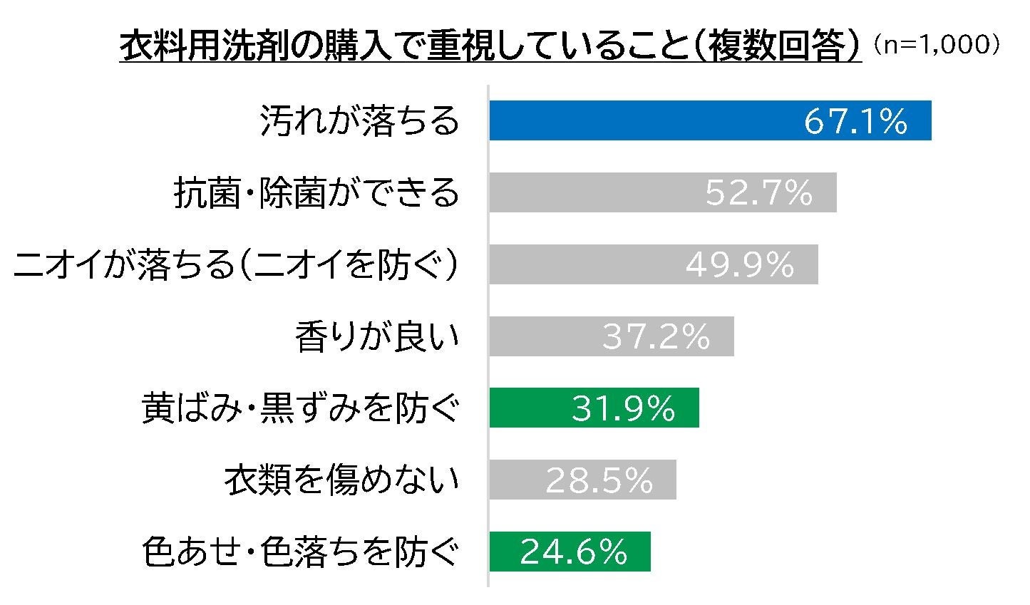 多くの人が経験している、洗濯による色変化のトラブルですが、衣料用洗剤を購入する時に重視している機能は、どのような点かを尋ねてみました。その結果、「汚れが落ちる」(67.1%)が圧倒的に高く、色変化を防ぐ機能「黄ばみ・黒ずみを防ぐ」(31.9%)や「色あせ・色落ちを防ぐ」(24.6%)は、汚れ落ちに対して半数以下の人しか重視していません。