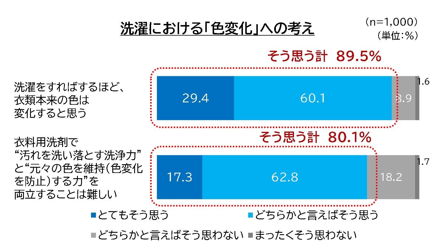 重視していない背景には、“あきらめ”がありそうです。約9割(89.5%)の人が、「洗濯をすればするほど、衣類本来の色は変化すると思う」と考え、「衣料用洗剤で“汚れを洗い落とす洗浄力”と“元々の色を維持(色変化を防止)する力”を両立することは難しい」と考える人は、約8割(80.1%)という結果でした。