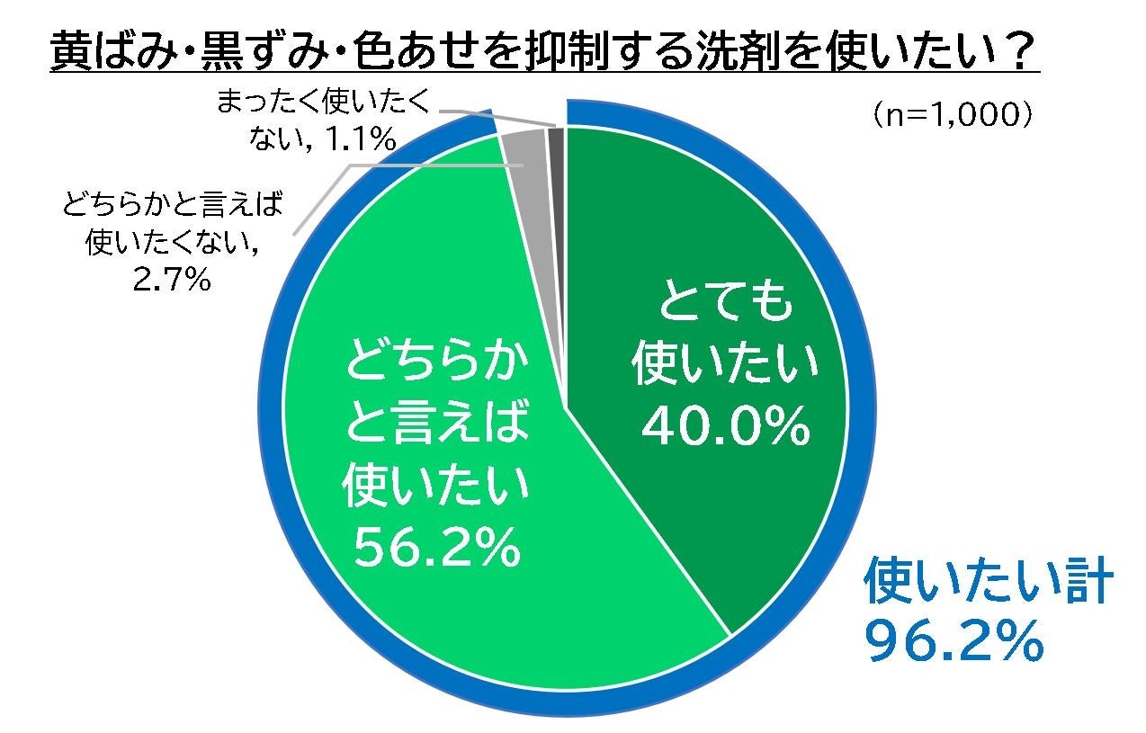 回答者全員に「黄ばみ・黒ずみ・色あせを抑制する洗剤」の利用意向を聞いてみました。その結果、ほぼ全員に当たる96.2%の人が「使いたい」と回答しました。