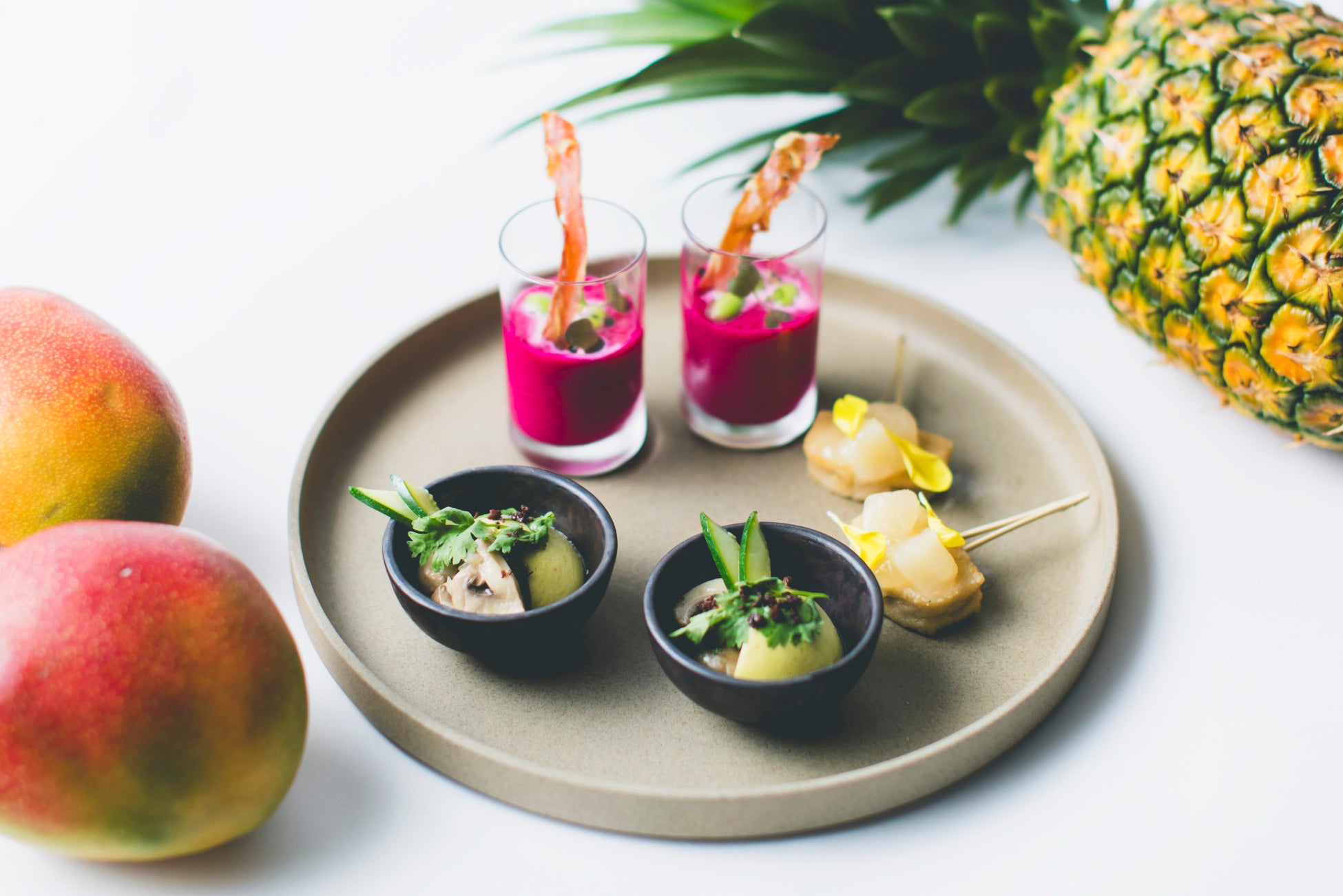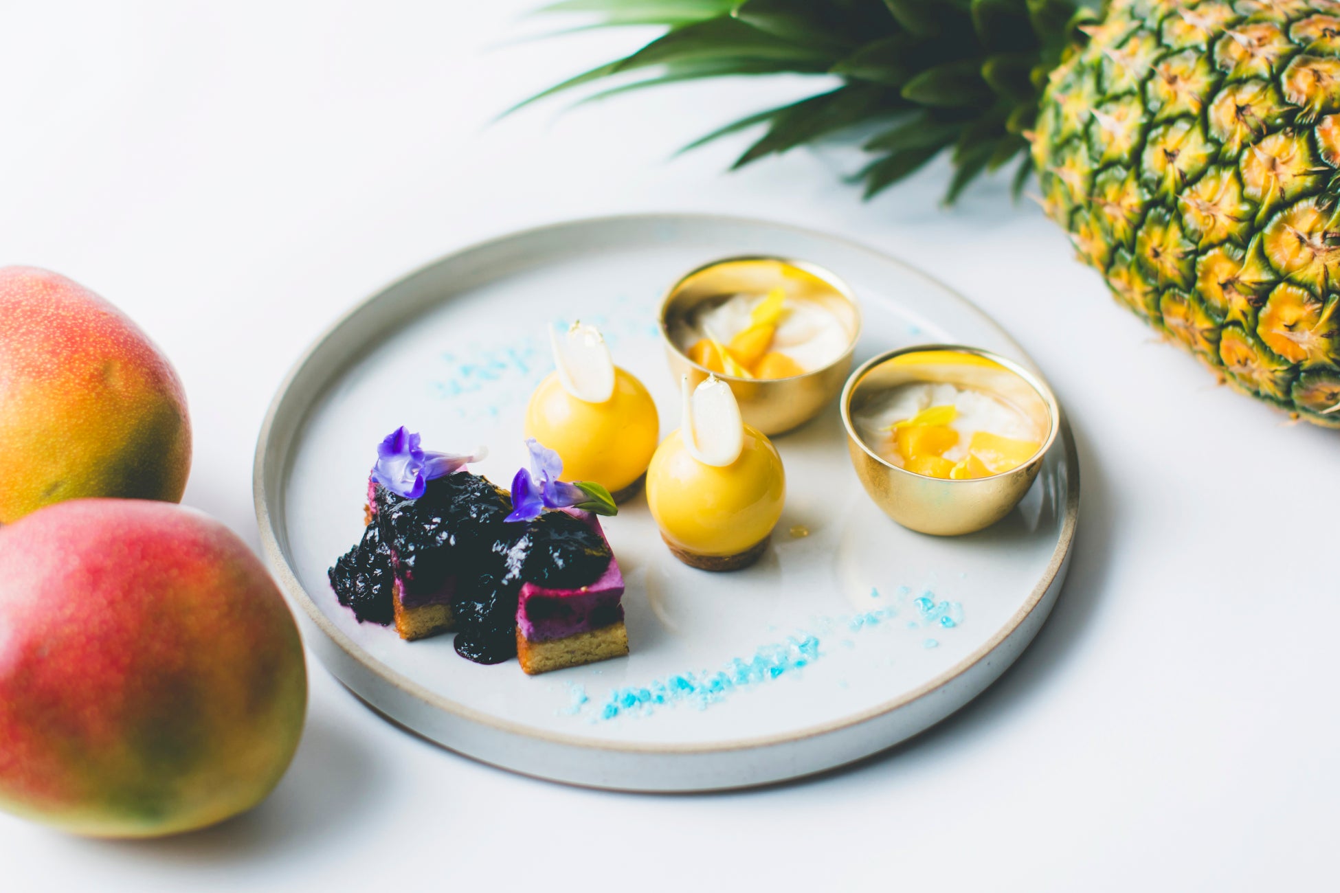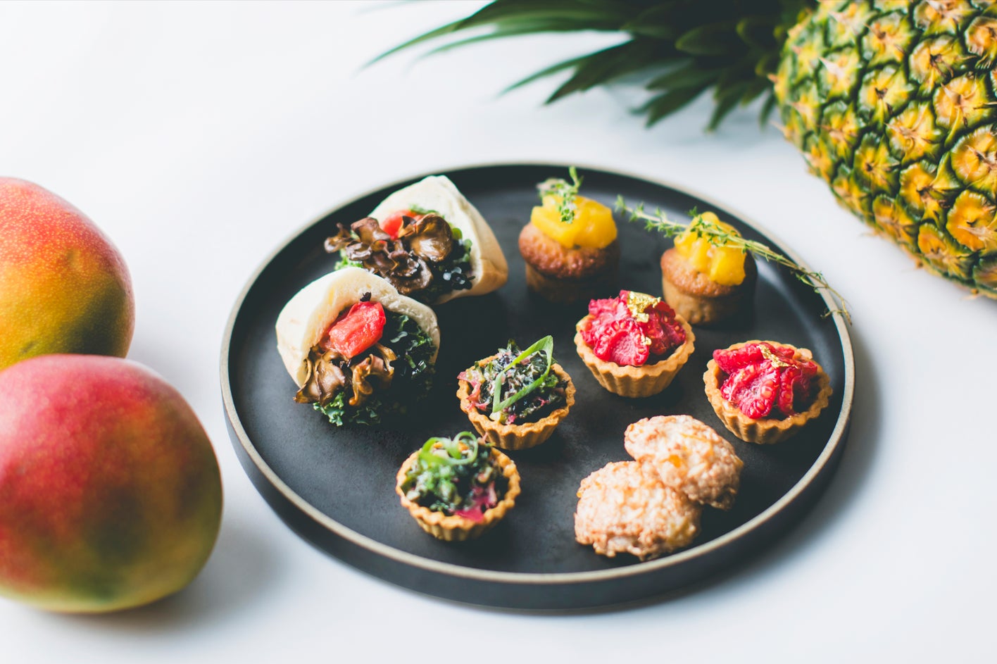 デザートにはマンゴーやパイナップル、夏のベリーを使い、旬のトロピカルフルーツの魅力を存分に生かしたラインナップが勢ぞろい。セイヴォリーは生麩やフムス、野菜を中心としたお肉や魚の使用を控えたヘルシーで
