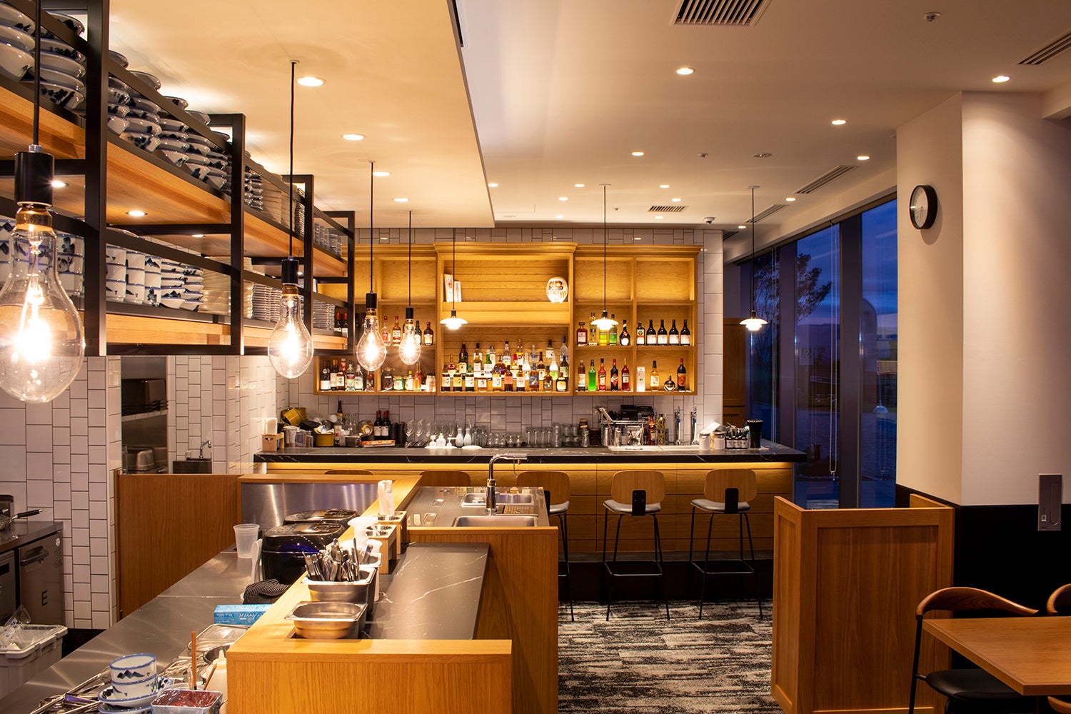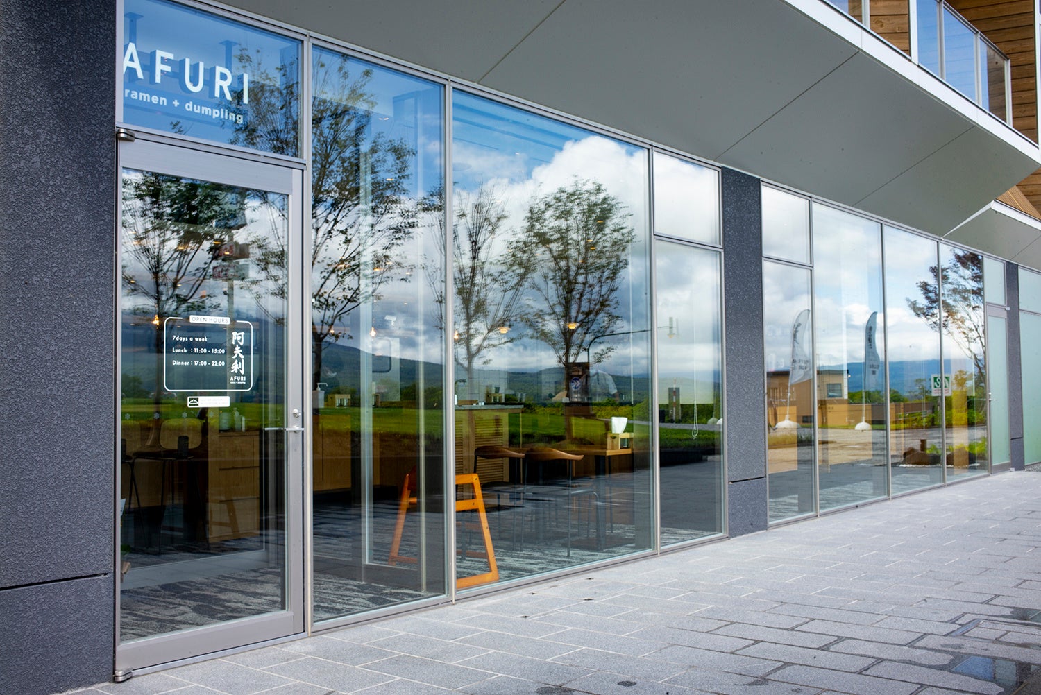 AFURI ramen + dumpling 雪ニセコは、その一階に位置し、美しい羊蹄山を眺めながらお食事や豊富なアルコールメニューをお楽しみいただけます。