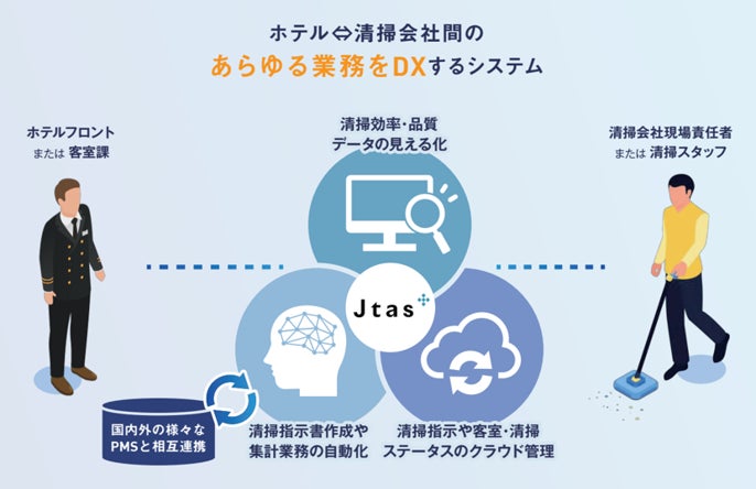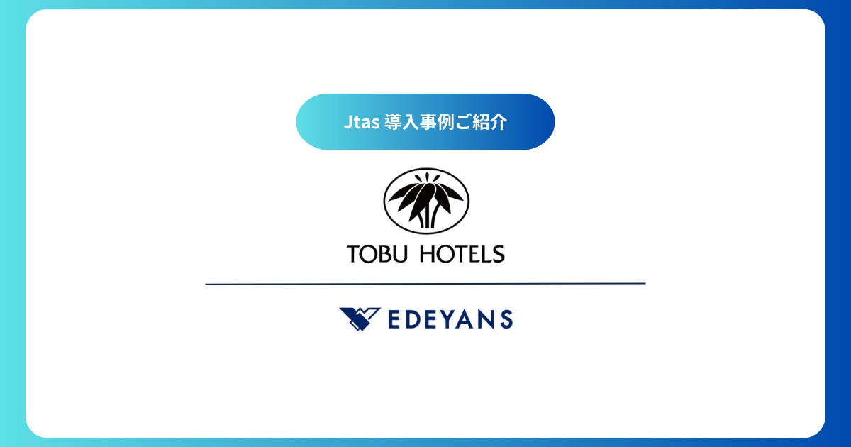 株式会社Edeyans(東京本社:東京都中央区、大阪本社:大阪市中央区、代表取締役社長:片山 裕之、以下「Edeyans」)と株式会社東武ホテルマネジメント(東京都墨田区、代表取締役社長:三輪 裕章、以下「東武ホテルマネジメント」)は、客室清掃領域の生産性と品質向上を目指し、客室清掃DXプラットフォーム 「Jtas-ジェイタス-」(以下、「Jtas」)に係る包括契約を締結しましたことをお知らせします。