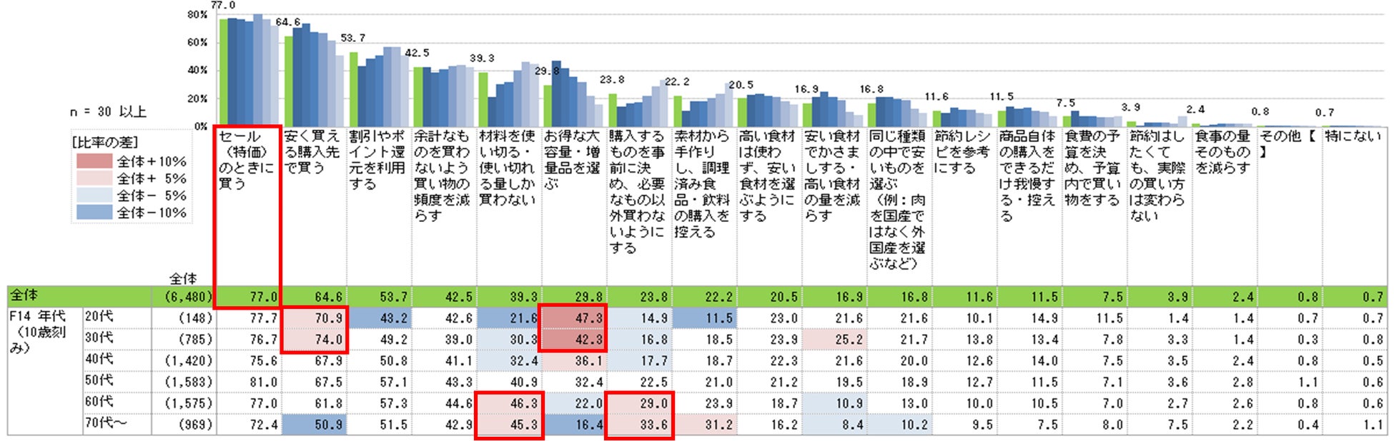 ■食費を節約するときに選ぶ方法について尋ねたところ、「セール(特価)のときに買う」(77.0%)が頭一つ抜けて1位となる結果に。他の回答については年代によって差があることが判明。