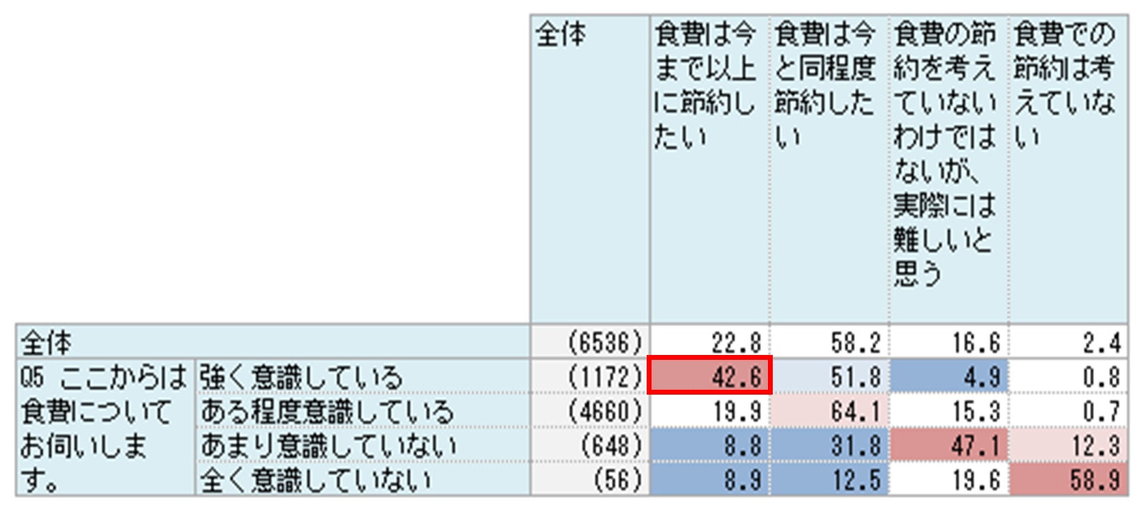 現在、節約意識の強い人ほど、「今まで以上に節約したい」という回答の割合が高く、節約意識の高い人は、現状の節約では足りないと感じる人も多いのではないかと推測することができます。20代では、「食費は今まで以上に節約したい」が39.7%と他の年代と比較すると高い割合となりました。一方で「食費は今と同程度節約したい」を回答する割合は49.7%と昨年時よりも11.9%減少しました。