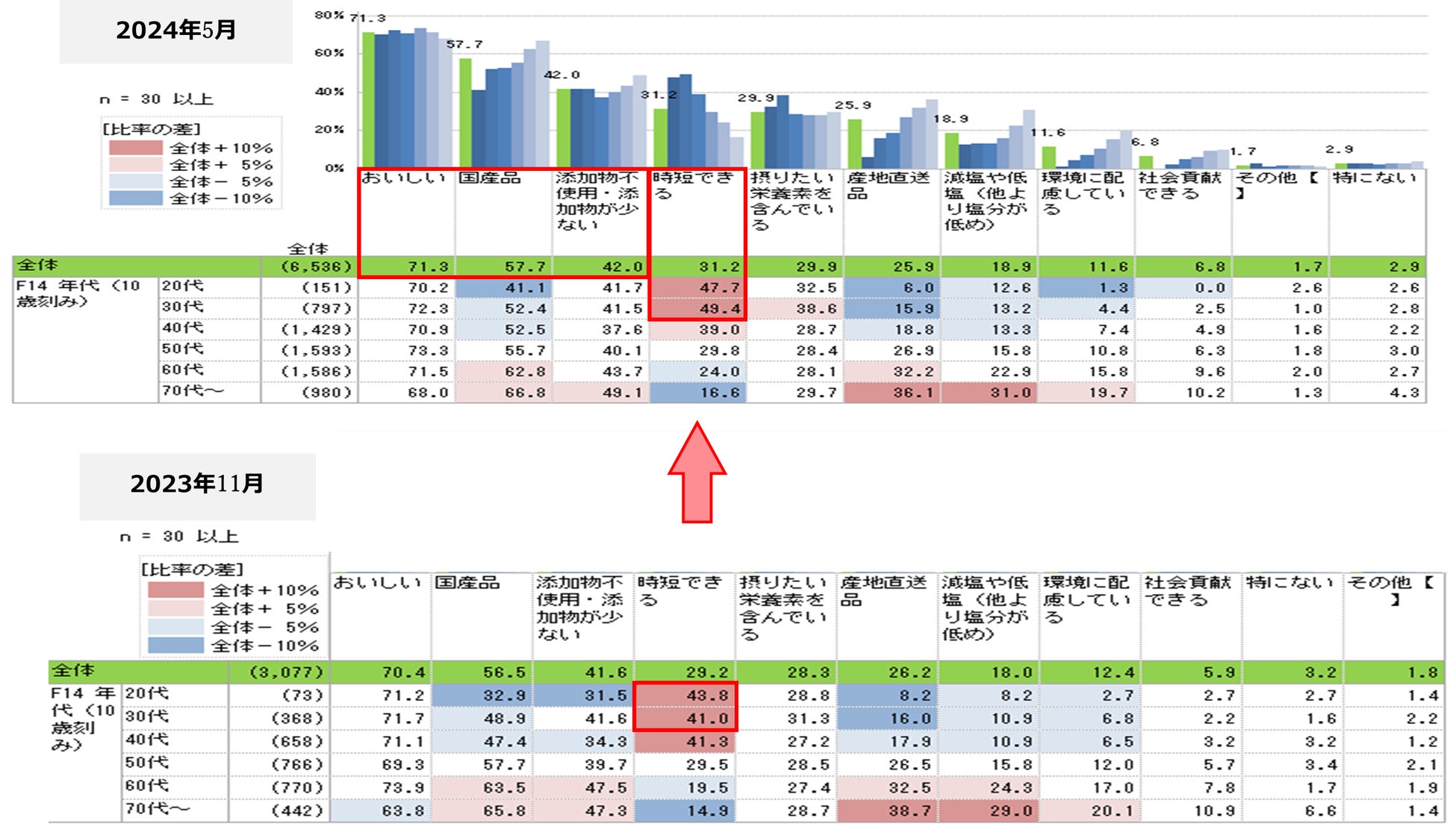 食品を買う際に多少価格が高くても買う理由となるものについて尋ねた質問 では、2023年11月実施時の結果と変わらず「おいしい」(71.3%)、「国産品」(57.7%)、「添加物不使用・添加物が少ない」(42.0%)がランクインしました。4位の「時短できる」(31.2%)については、若年層の回答率が増加し、それぞれ20代は3.9%、30代は8.4%増加しました。若年層の「時短」における意識の変化が読み取れます。