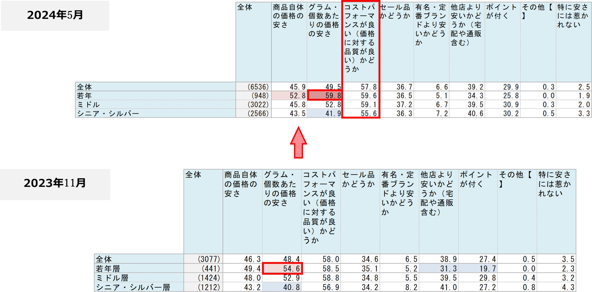 2位の「グラム・個数あたりの価格の安さ」(49.5%)は、前回調査に引き続き若年層で高い傾向となり、23年11月の実施時と比較すると5.2%増加する結果となりました。節約を強く意識している人は61.6%が同回答を選択し、前回の2位から1位になりました。人々は商品の価格だけでなく、コスパ、グラムあたりの価格を見て、“安さ”を判断して買い物をする傾向が強まっているということが分かりました。