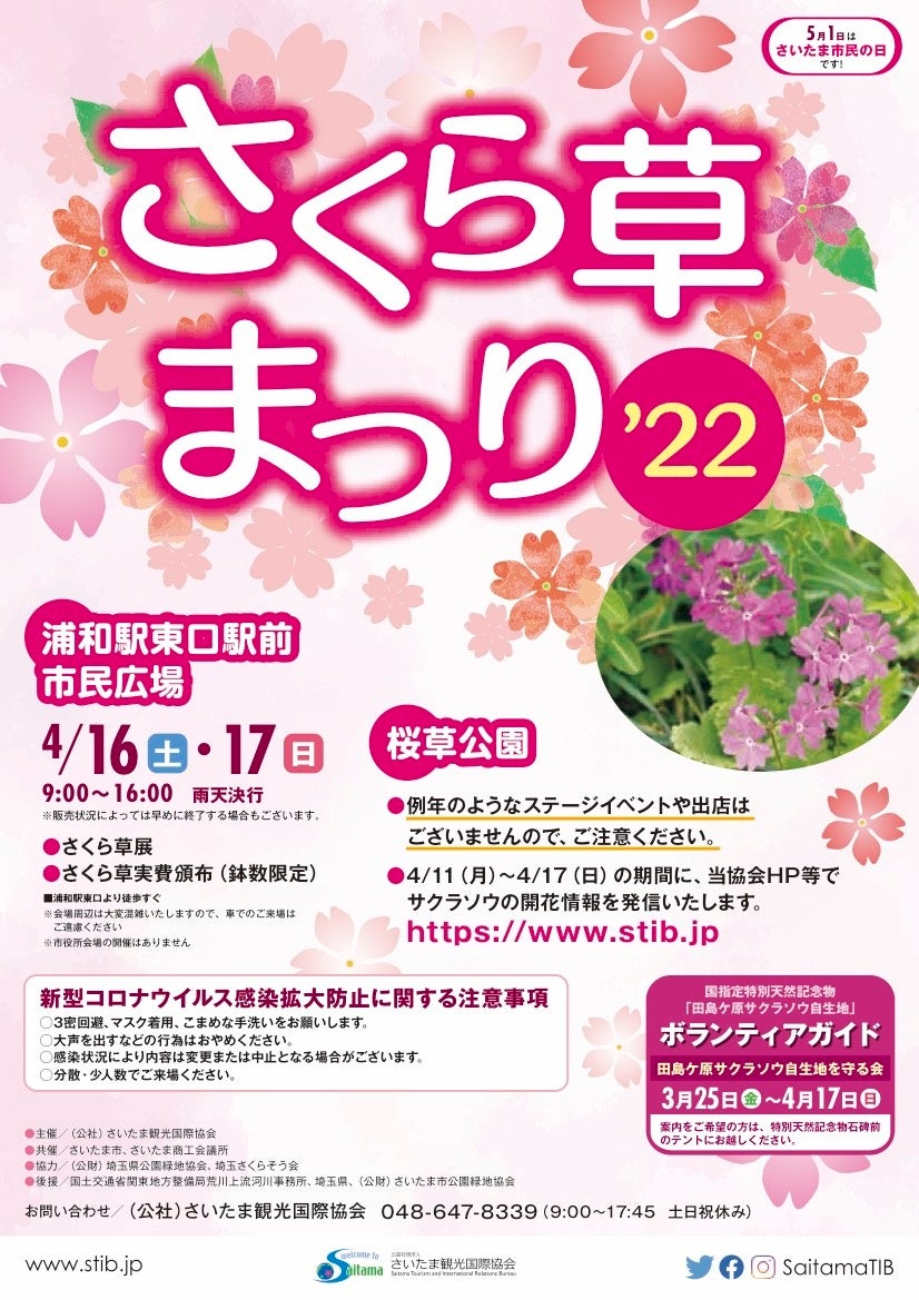 国の特別天然記念物に指定されている田島ケ原サクラソウ自生地の開花時期に合わせて、4月16日(土)・17(日)に浦和駅東口駅前市民広場で「さくら草まつり」を開催します。また、4月11日(月)〜4月17日(日)は桜草公園(田島ケ原サクラソウ自生地)のサクラソウの開花情報を公益社団法人さいたま観光国際協会のホームページでお知らせします。
