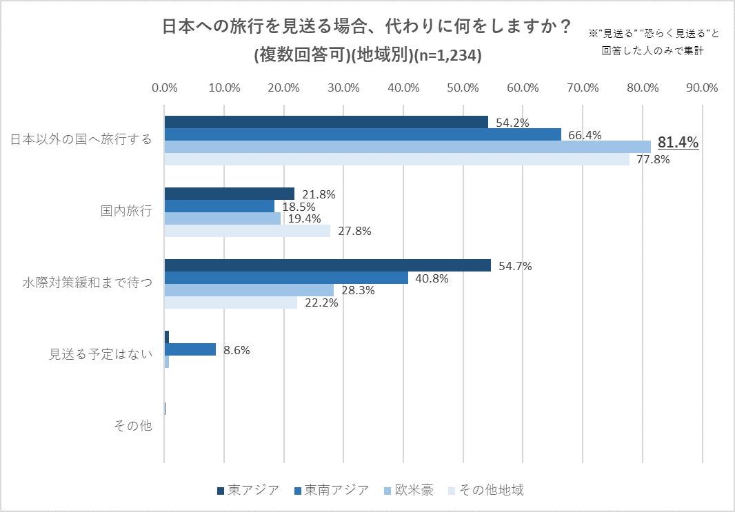 現在の水際対策が継続される場合、72.0%が訪日旅行を見送る・恐らく見送ると回答。また、訪日旅行を見送る場合、63.3%が日本以外の国へ旅行する、20.5%が自国で旅行するという回答結果となった。また、欧米豪地域では、現在の水際対策が継続される場合、81.4%が日本以外の地域で旅行をすると回答している。
