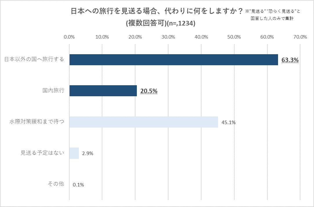 調査では、回答者の70%以上が訪日旅行を見送る・恐らく見送ると回答。訪日旅行を見送る場合には、半数以上が日本以外の国へ旅行すると回答しました。