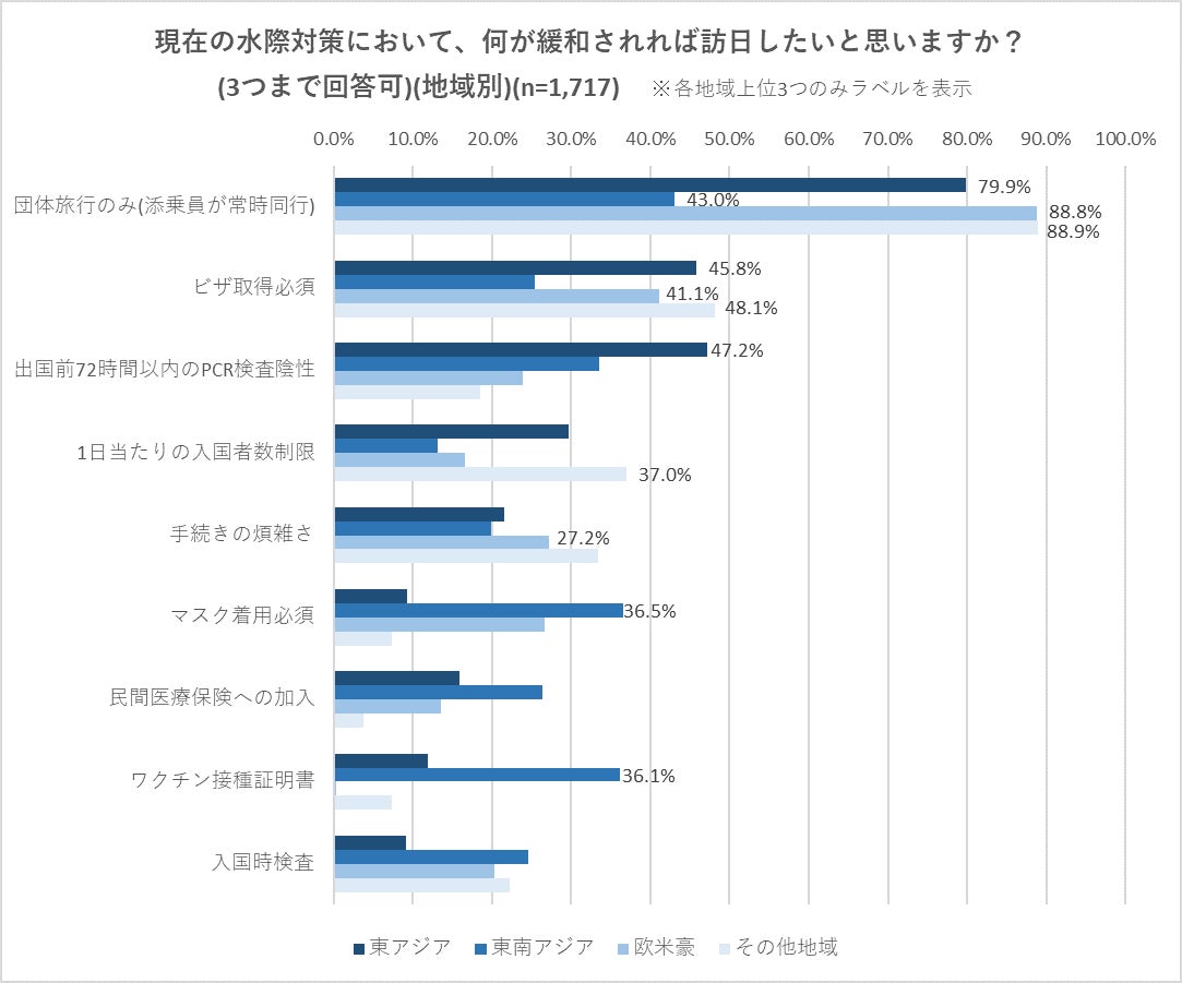 観光目的における日本の水際対策について何が課題になるかの調査結果については、団体旅行が71.2%、ビザ取得必須が39.1%、出国前72時間以内のPCR検査陰性が38.3%と上位を占めた。また、団体旅行は全ての地域で最も緩和が求められる項目となった。地域別にみると、欧米豪地域ではビザ取得が次点となり、今までビザ不要であったことから上位になったと考えられる。東アジアでは、マスク着用必須に対する抵抗が少ないことが特徴的で、緩和して欲しいと回答したのは9.2%と1割を下回る結果となった。一方、東南アジアでは、団体旅行に次いでマスク着用が要緩和項目の次点となり、ビザ取得やPCR検査よりもマスク着用緩和の方が優先順位が高い結果となった。