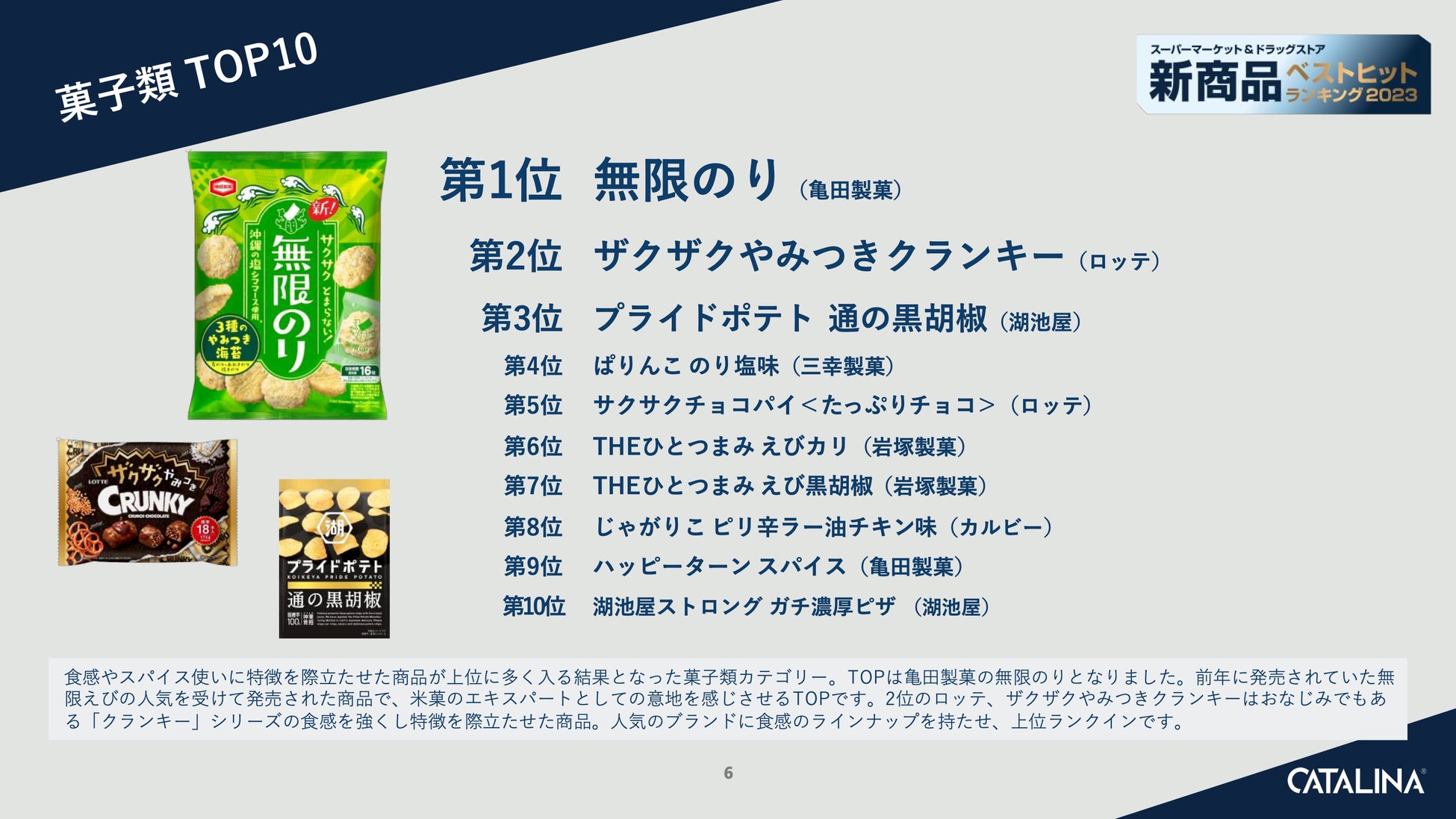 食感やスパイス使いに特徴を際立たせた商品が上位に多く入る結果となった菓子類カテゴリー。TOPは亀田製菓の無限のりとなりました。前年に発売されていた無限えびの人気を受けて発売された商品で、米菓のエキスパートとしての意地を感じさせるTOPです。2位のロッテ、ザクザクやみつきクランキーはおなじみでもある「クランキー」シリーズの食感を強くし特徴を際立たせた商品。人気のブランドに食感のラインナップを持たせ、上位ランクインです。