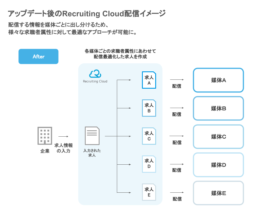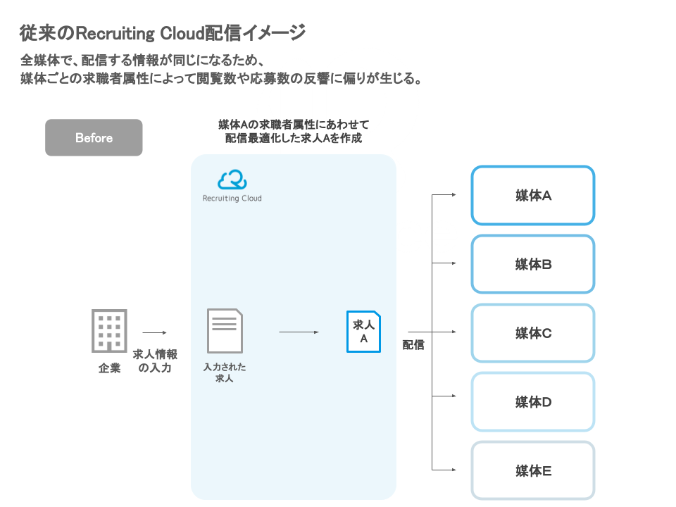 従来より、Recruiting Cloudは150超の連携媒体との提携を通じ、求人内容に合わせて独自の求人ネットワークに自動で最適化配信を行って参りました。