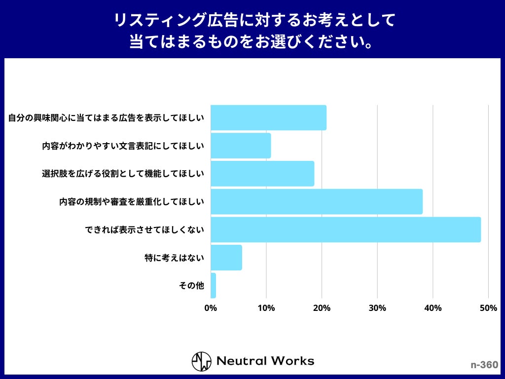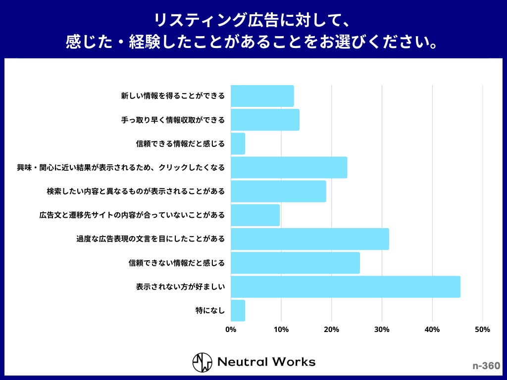 デジタルマーケティング支援をしている株式会社ニュートラルワークス(神奈川県茅ヶ崎市 代表取締役:三木五月、以下「ニュートラルワークス」)は、20代以上の男女360名を対象に、「リスティング広告に関するユーザー意識」に関する調査を行いました。