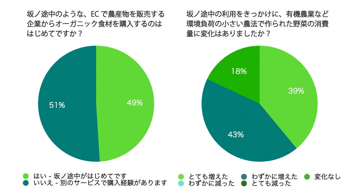 また、坂ノ途中の利用顧客のうち、約半数が「ECからはじめてオーガニック食材を購入した」と回答し、「坂ノ途中の利用をきっかけに有機農業など環境負荷の小さい農法で作られた野菜の消費量が増加した」の回答が82%でした。