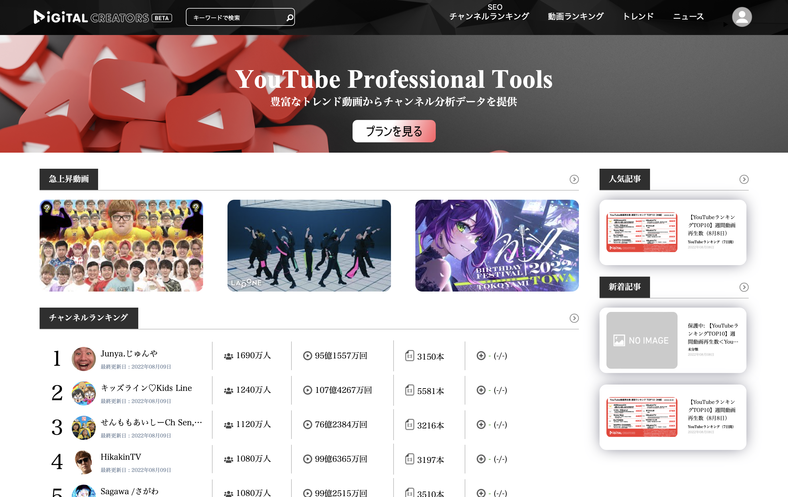 Digital Creatorsは、YouTubeの人気チャンネルや動画などのランキングデーターを無料でチェックできるサイトです。