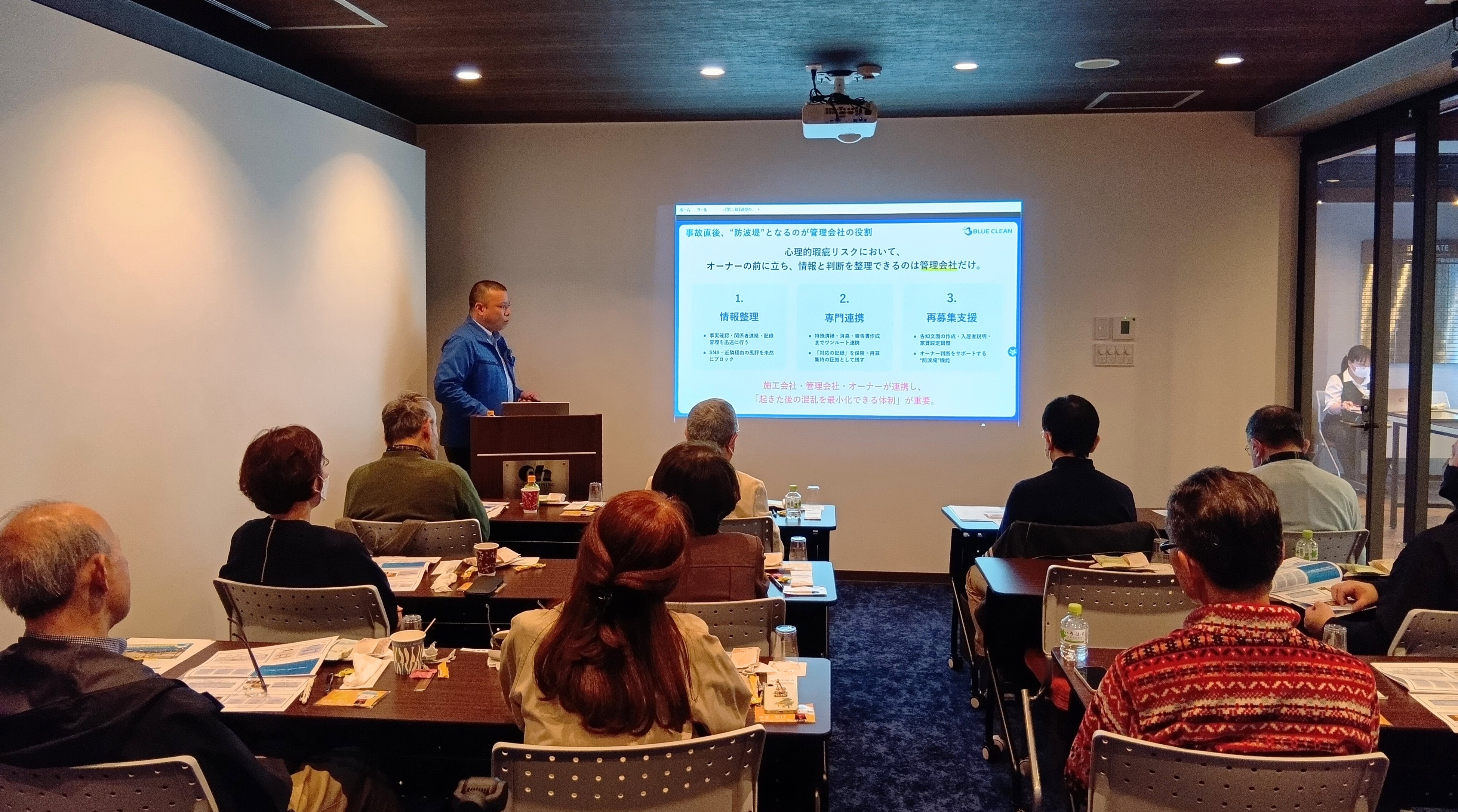 バイオリカバリー事業(特殊清掃などの衛生復旧サービス)を展開するブルークリーン株式会社(本社:東京都大田区、代表取締役:藤田隆次、以下「当社」)は、2026年2月23日に株式会社シティ・ハウジング(「満室の窓口 大田・品川」)主催で開催された賃貸オーナー向け勉強会「入居中トラブル対処法 大公開セミナー」にて、取締役・環境復旧対策部 部長の鈴木亮太が講師として登壇したことをお知らせします。鈴木は、特殊清掃領域の情報発信を行うYouTubeチャンネル「特殊清掃CH|すーさん」としても活動しており、本勉強会でも同呼称(すーさん)で登壇しました。
