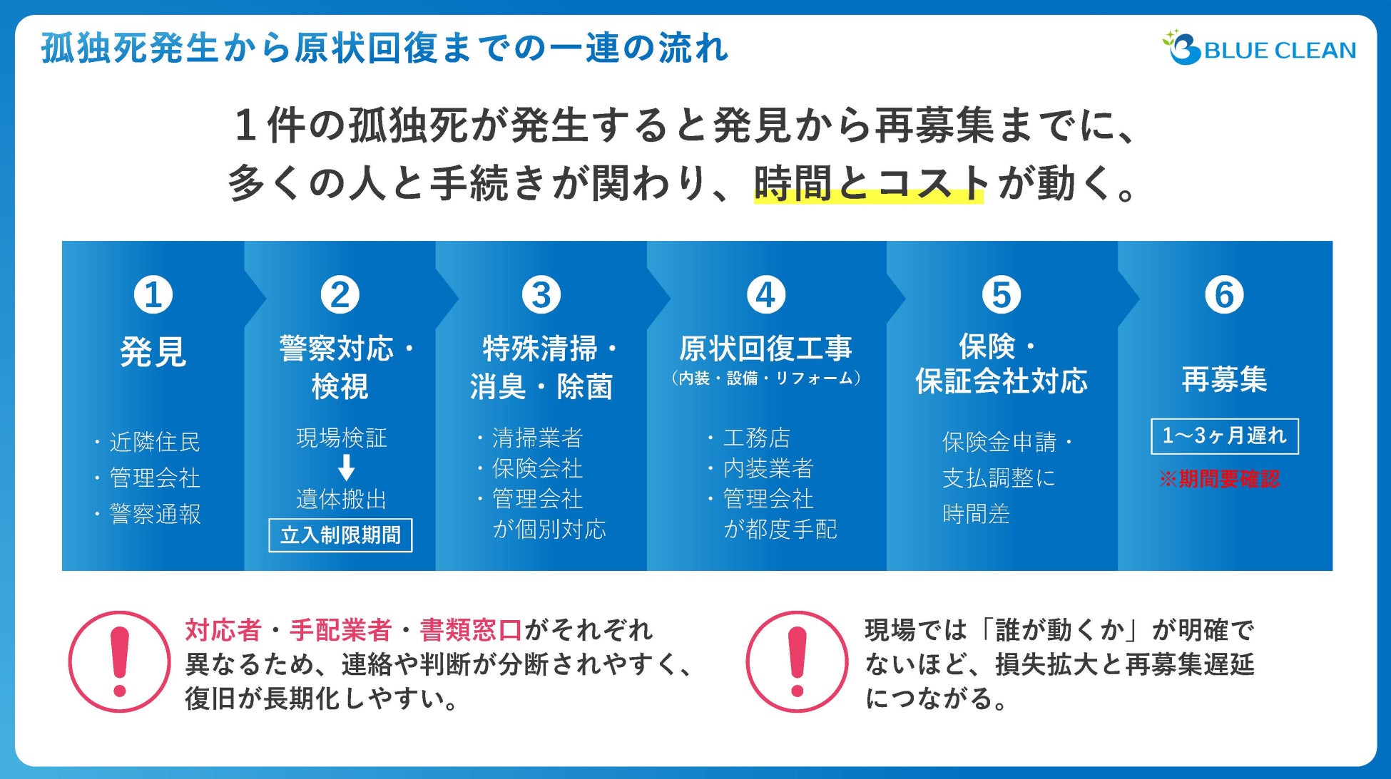 セミナーでは、「1件の孤独死」でも、発見から再募集までに多くの関係者・手続きが絡み、時間とコストが大きく動く点を、フローで整理しました。ポイントは「工程が増えること」そのものより、対応者・手配業者・書類窓口が分断されるほど、連絡と判断が遅れ、復旧が長期化しやすいことです。