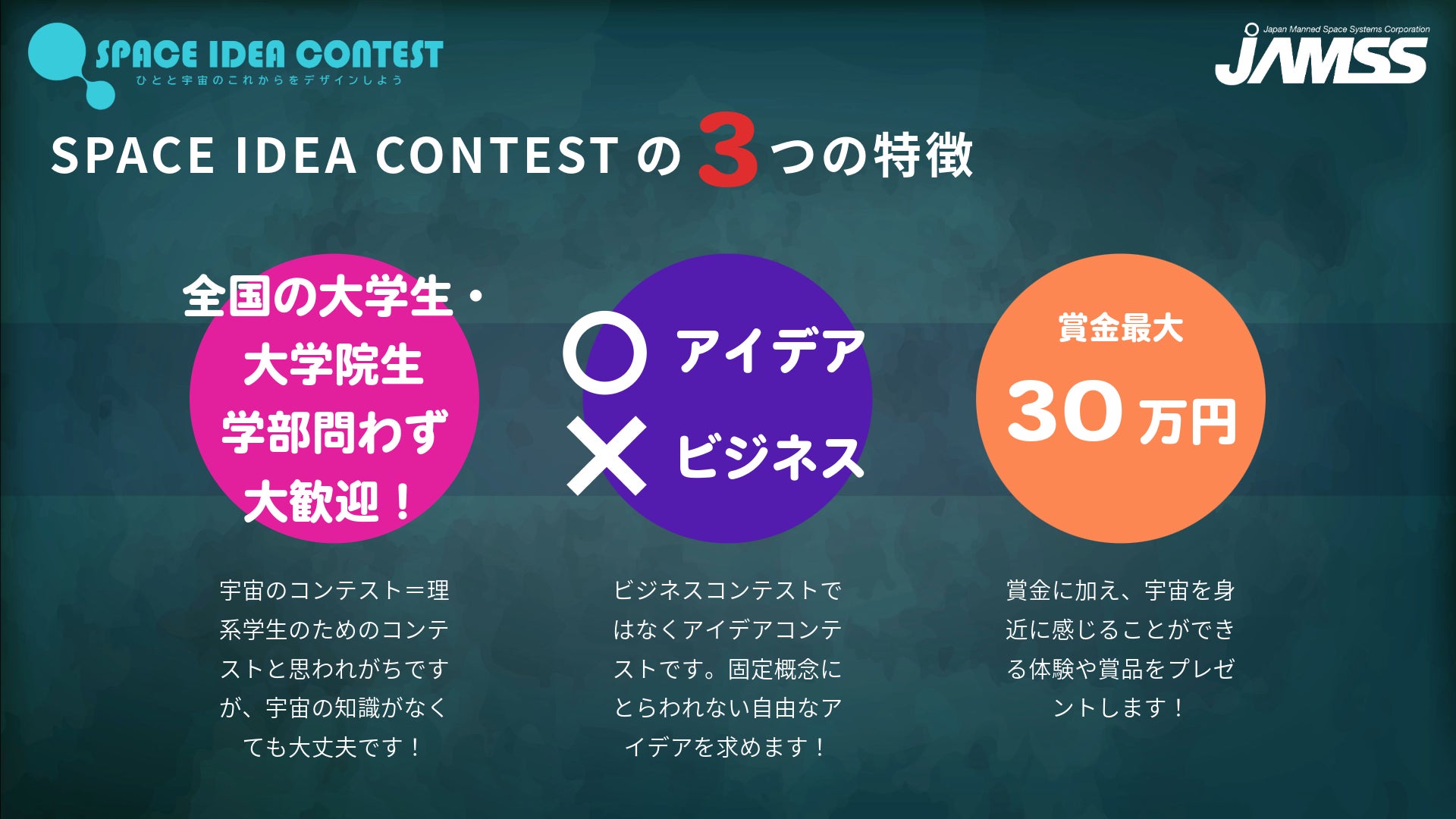 本コンテストは、ひとと宇宙のこれからをデザインする学生向けアイデアコンテストです。参加者には自分の得意と宇宙をかけ合わせ、「行ってみたくなる」「暮らしたくなる」宇宙を、そして「住み続けたくなる」「もっと大切にしたくなる」地球のアイデアを提案してもらいます。
