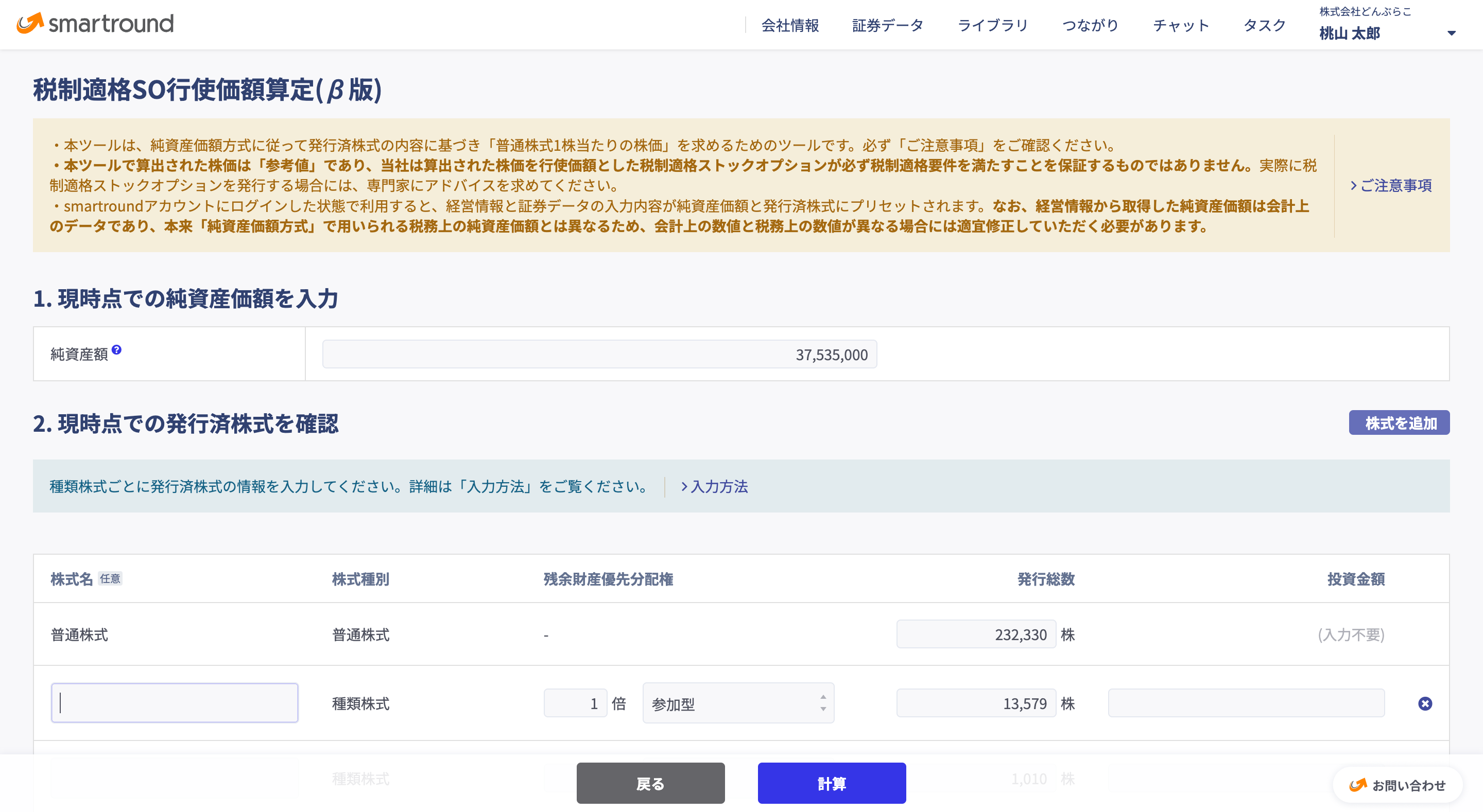 無料・ログイン不要で税制適格ストックオプション発行のための株価算定が可能に!