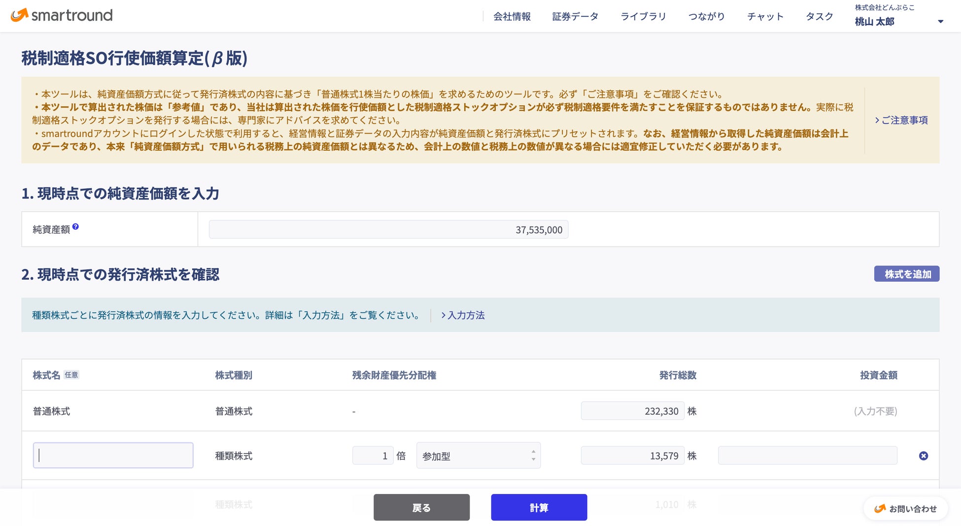 そこで、スマートラウンドでは、スタートアップが税制適格ストックオプションをより活用しやすくなる環境を実現すべく、発行している種類株式の内容を勘案した「純資産価額方式(※)」による参考株価を算定できる機能を提供することにいたしました。
