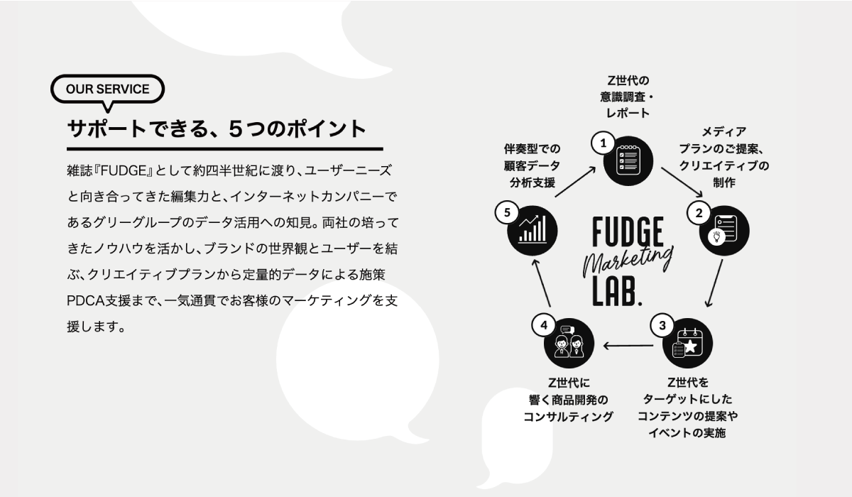 『FUDGE Marketing LAB.』は、Z世代のファンを多く抱えるFUDGEのクリエイティブ力とデータマーケティングカンパニーGlossomの強みをかけ合わせることで、Z世代のインサイトを読み解いて、企業のプロモーションをサポートします。