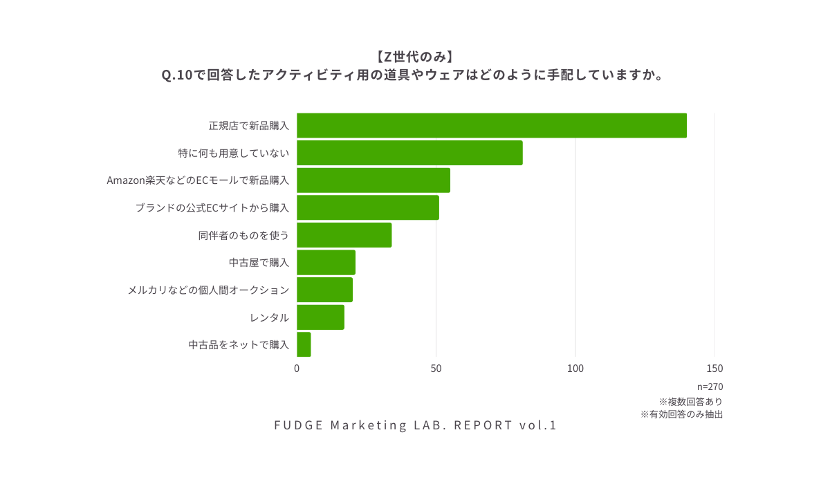 「Q.10で回答したアウトドアアクティビティ用の道具やウェアはどのように手配していますか。」の回答を集計しました。アウトドアアクティビティには、専門のグッズ・ギアが必要なこともしばしば。比較的単価が高くなりやすいアウトドア用のグッズ・ギアですが、FUDGEユーザー(Z世代)では正規店で新品購入派が多い結果となりました。