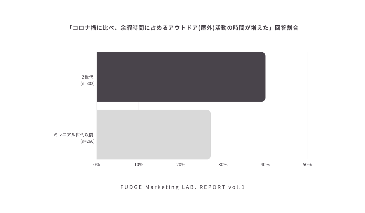 すると、Z世代の約40%が「余暇時間に占めるアウトドア活動の時間が増えた」と回答し、ミレニアル世代以前に比べて約13ポイント高い結果となりました。