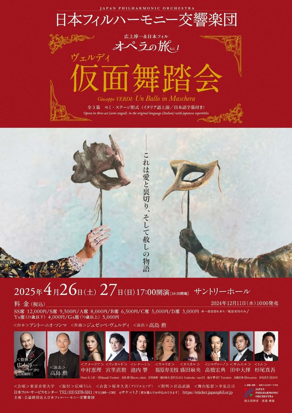 公益財団法人日本フィルハーモニー交響楽団(東京都杉並区、理事長:平井俊邦)は、2025年4月26日(土)、27日(日)東京・サントリーホールで<広上淳一&日本フィル「オペラの旅」Vol.1>ヴェルディ:オペラ《仮面舞踏会》を上演します。
