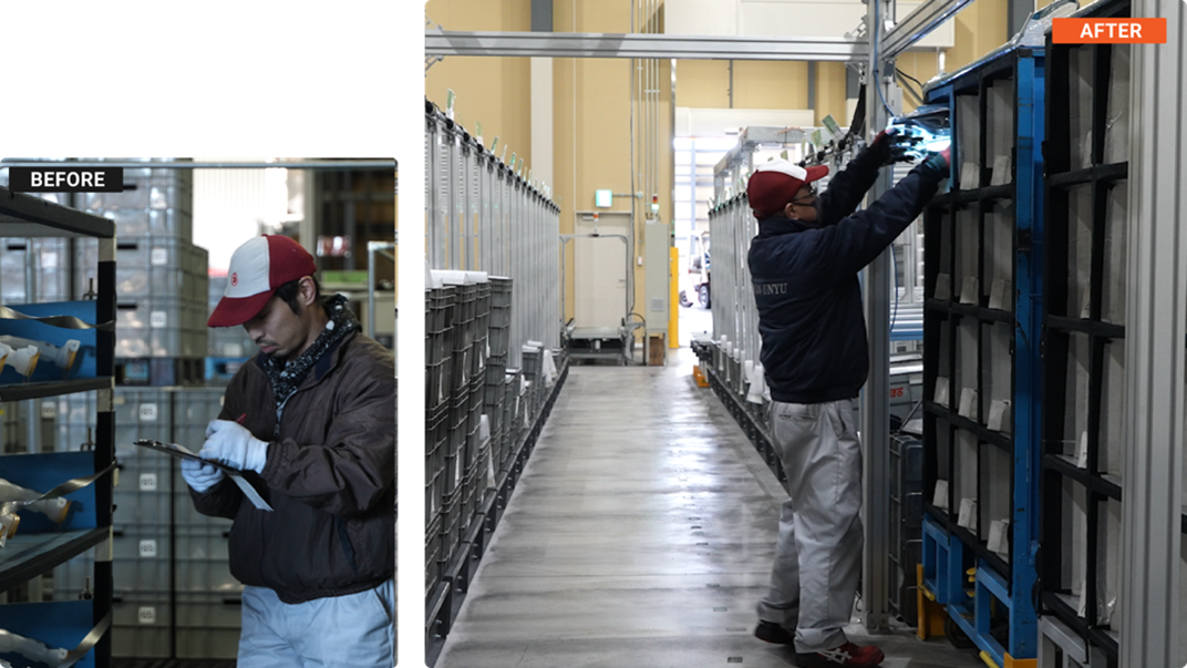完成車メーカーの部品供給を担う日本運輸様の倉庫も同様に、サプライヤー各社から集約された部品ピッキング作業の多くが、人手と属人的な判断・作業に依存していました。