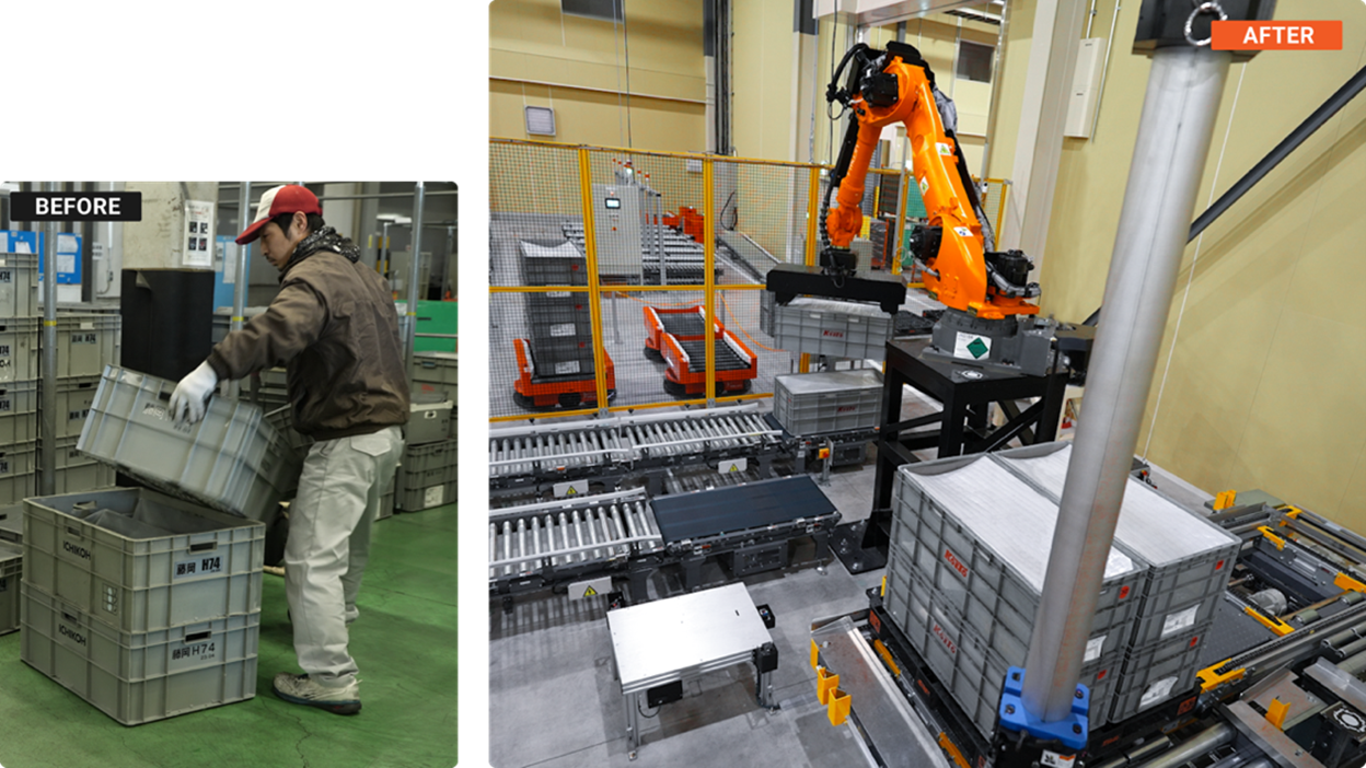 97種の製品を対象に、通い箱デパレタイズ/パレタイズロボットとAGVによる品種別の自動補充を実現。知能ロボットは、ミリ単位の高精度な嵌め合わせや左右部品の混載パレット、サイズ差の大きい通い箱にも柔軟に対応し、高精度な段積みを可能にしています。